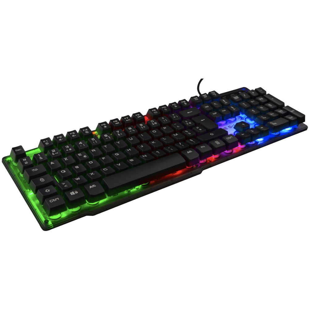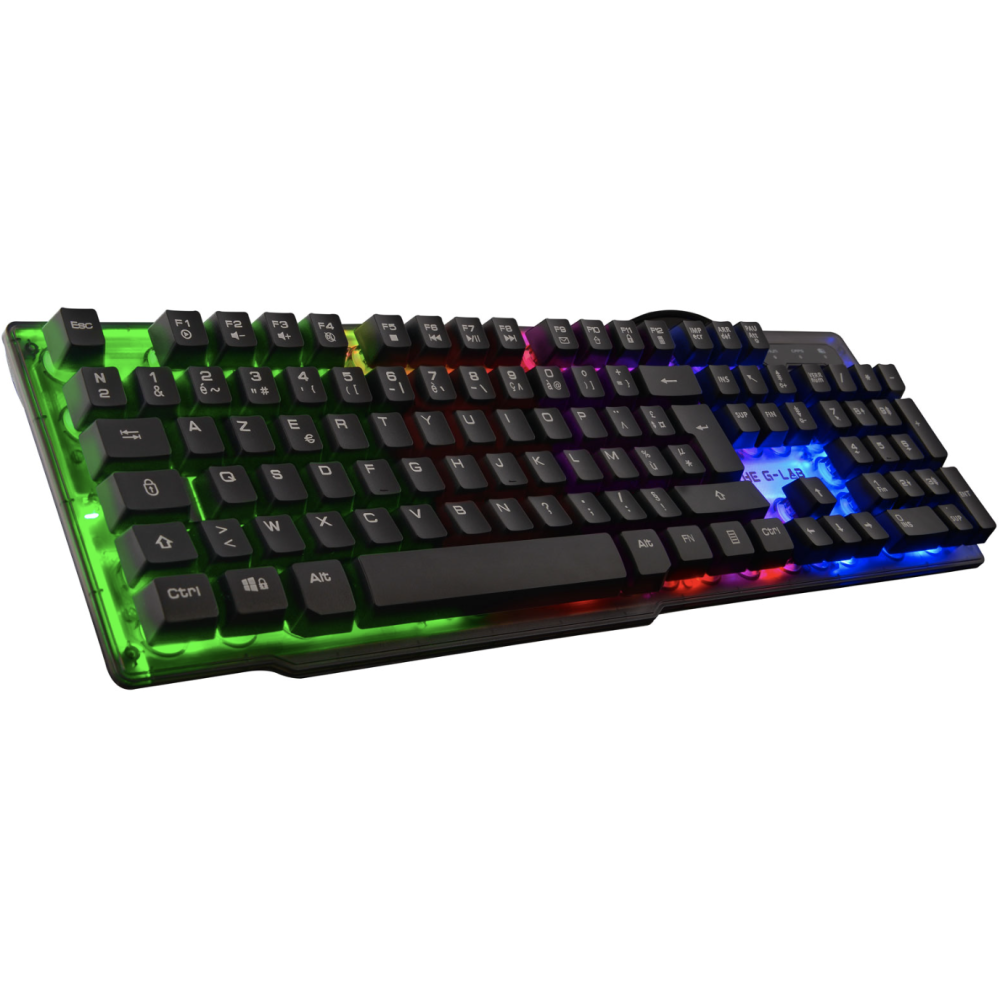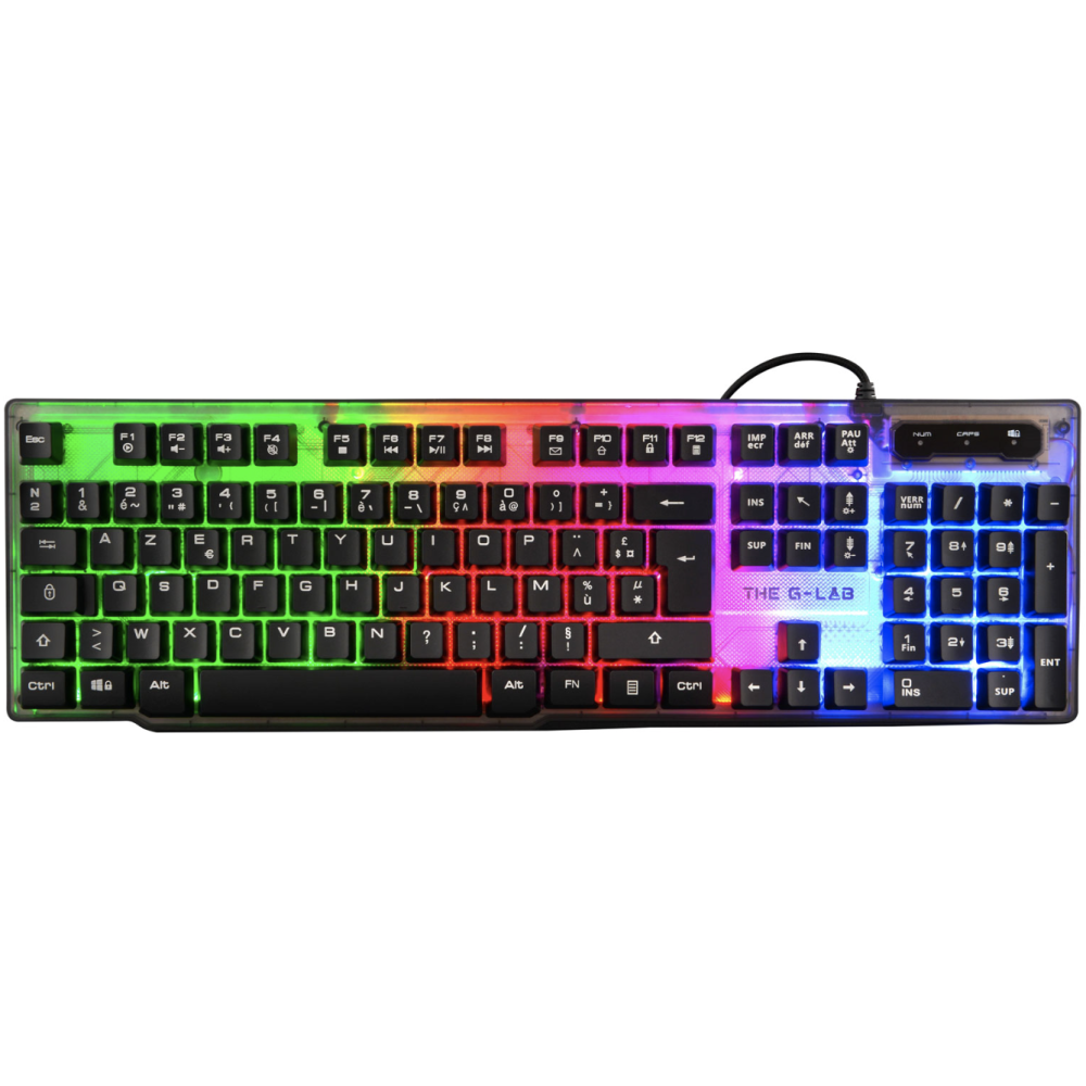 Clavier Gaming Membrane - Marque : THE G-LAB KEYZ - Utilisation : Gamer - Couleurs : Noir et gris - Connexion : Filaire - Type de clavier : Membrane - Type de touche : Membrane réactive et silencieuse - Rétroéclairage : Rainbow (rétroéclairé) - Interface avec le PC : USB - Anti-ghosting : 19 touches - Pilote de personnalisation : Non - Compatibilité : PC, PS4, XBOX - Longueur du câble : 1,5 m - Poids (avec câble) : 430 g - Durée de vie des touches : 12 millions de frappes - EAN : 3760162067682.