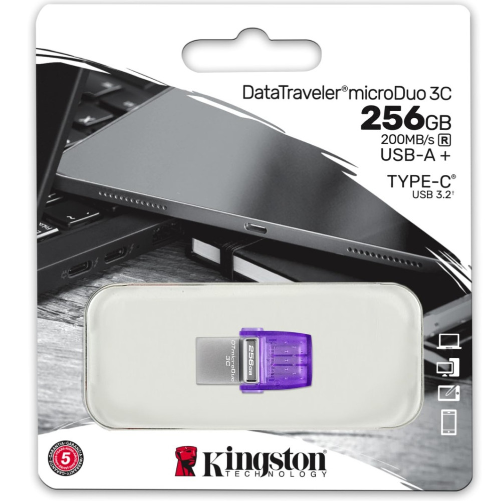 Kingston DataTraveler microDuo 3C - Clé USB - 256 Go - USB 3.2 Gen 1 / USB-C. Le produit mini qui transporte un maximum de données. Si vous avez des fichiers numériques, vous pouvez les transporter partout avec les clés USB DataTraveler Kingston.