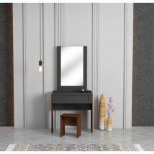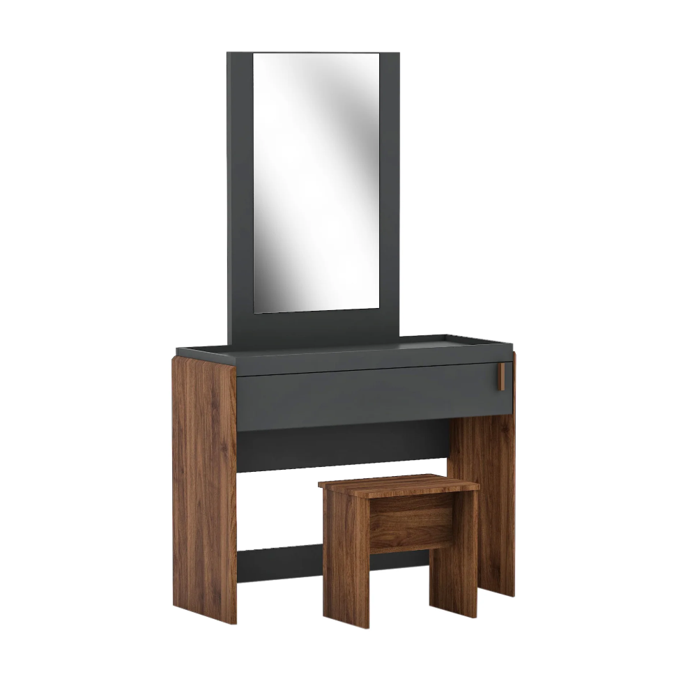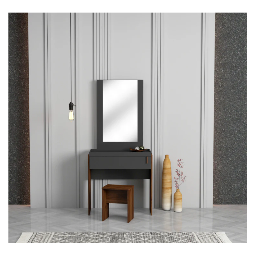 Coiffeuse Modi YC DT00905-MP - Couleur : gris sombre - Conçue avec des finitions de haute qualité et des angles nets - Posée sur 2 grands supports latéraux de forme rectangulaire et disposé verticalement comme des pattes - Dimensions : longueur de 830 cm, 415 cm de large et 1665 cm de haut - Inclut un miroir rectangulaire qui renvoie fidèlement le reflet en position assise - Proposée avec un tabouret fabriqué aux mesures de la coiffeuse et s’intégrant parfaitement sous le tiroir - Embarque un tiroir pour le rangement aisé de produits divers.