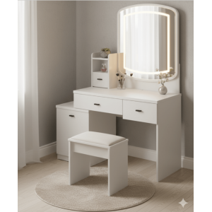 Coiffeuse de couleur blanche à disposer dans une chambre à coucher - Constituée d’un tabouret rembourré et conçu sur-mesure pour être inséré sous le miroir et de 3 tiroirs et 1 porte pour le rangement d’accessoires de beauté divers - Inclut un grand miroir doté d’un éclairage Led - Convient pour disposer des parfums, des outils de maquillage et des bijoux - Mesure 115,5 cm de long, 80 cm de large et 40 cm de profondeur - Idéale pour faire une mise en beauté rapide ou réaliser une routine beauté quotidienne - Dispose de dimensions compactes qui permettent un gain de place dans la pièce.