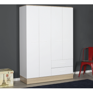 Armoire 4 portes et 2 tiroirs couleur blanc et chêne - Offre un grand espace de rangement: côté droit 2 portes avec 4 sections et 2 tiroirs en bas, côté gauche 2 portes avec 1 étagère en haut, 1 étagère en bas et 1 penderie au milieu - Design moderne pratique et astucieux pour optimiser le rangement - Idéale pour embellir votre intérieur - 100% en panneau de particules mélaminés - Dispose de poignées de couleur blanche - Ira bien dans une chambre à coucher enfant ou adulte - Livrée avec son kit de montage - Dimensions: 137x198x52 cm.