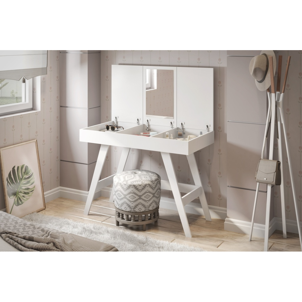 Il est temps d'avoir une coiffeuse raffinée pour ranger vos bijoux et votre maquillage. La coiffeuse est le choix idéal. Son design épuré allie fonctionnalité et élégance. Elle se replie pour former une table compacte, vous permettant ainsi de l'utiliser comme bureau. Elle est idéale pour les espaces restreints comme les studios et les résidences universitaires. Vous pourrez ranger tous vos essentiels sous le miroir et profiter de deux compartiments supplémentaires. Fabriquée en bois manufacturé de haute qualité, soigneusement peinte, elle s'adapte à presque tous les styles de décoration. Ses pieds sont robustes et stables. Dimensions: 1002 × 515 × 740 mm. Tabouret non inclus.