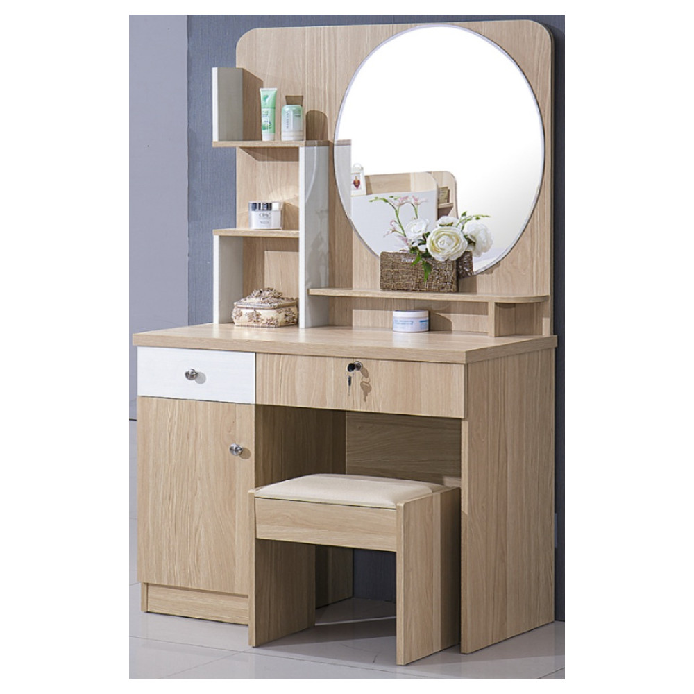Coiffeuse SW152-612 , avec 2 tiroirs,1 porte , tabouret et miroir. Dimensions: 800x400x1530. Coloris: papier décor effet bois clair.