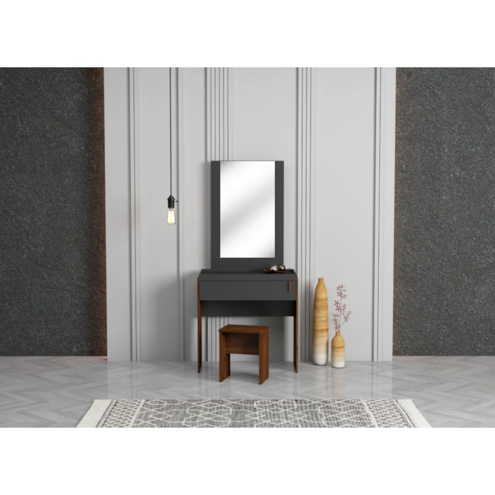 Coiffeuse Modi YC DT00905-MP - Couleur : gris sombre - Conçue avec des finitions de haute qualité et des angles nets - Posée sur 2 grands supports latéraux de forme rectangulaire et disposé verticalement comme des pattes - Dimensions : longueur de 830 cm, 415 cm de large et 1665 cm de haut - Inclut un miroir rectangulaire qui renvoie fidèlement le reflet en position assise - Proposée avec un tabouret fabriqué aux mesures de la coiffeuse et s’intégrant parfaitement sous le tiroir - Embarque un tiroir pour le rangement aisé de produits divers.