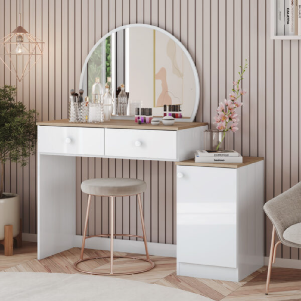 Coiffeuse blanche DZ33 moderne avec plusieurs possibilités de rangement - Meuble de style contemporain - Apporte une touche décorative moderne à votre intérieur - Conçue en bois et panneaux de particules - Finition blanc et chêne - Inclue un tiroir, un miroir et 2 mini étagères pour organiser vos accessoires de beauté - Pratique et esthétique.