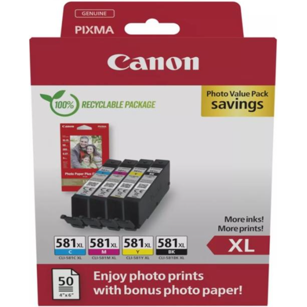 Canon CLI-581XL C/M/Y/BK Photo Value Pack - Pack de 4 - 8.3 ml - XL - noir, jaune, cyan, magenta - original - boîte - réservoir d'encre/kit papiers - pour PIXMA TS6251, TS6350, TS6351, TS705, TS8252, TS8350, TS8351, TS8352, TS9550, TS9551
