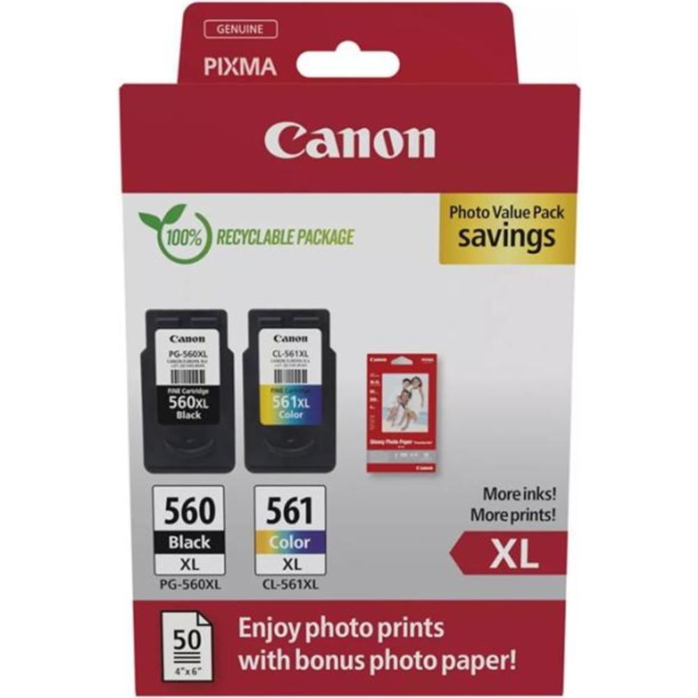 Canon PG-560XL/CL-561XL Photo Value Pack - Brillant - pack de 2 - à rendement élevé - noir, couleur (cyan, magenta, jaune) - original - boîte de suspension - jeu de papier / cartouche d'encre - pour PIXMA TS5350, TS5351, TS5352, TS5353, TS7450