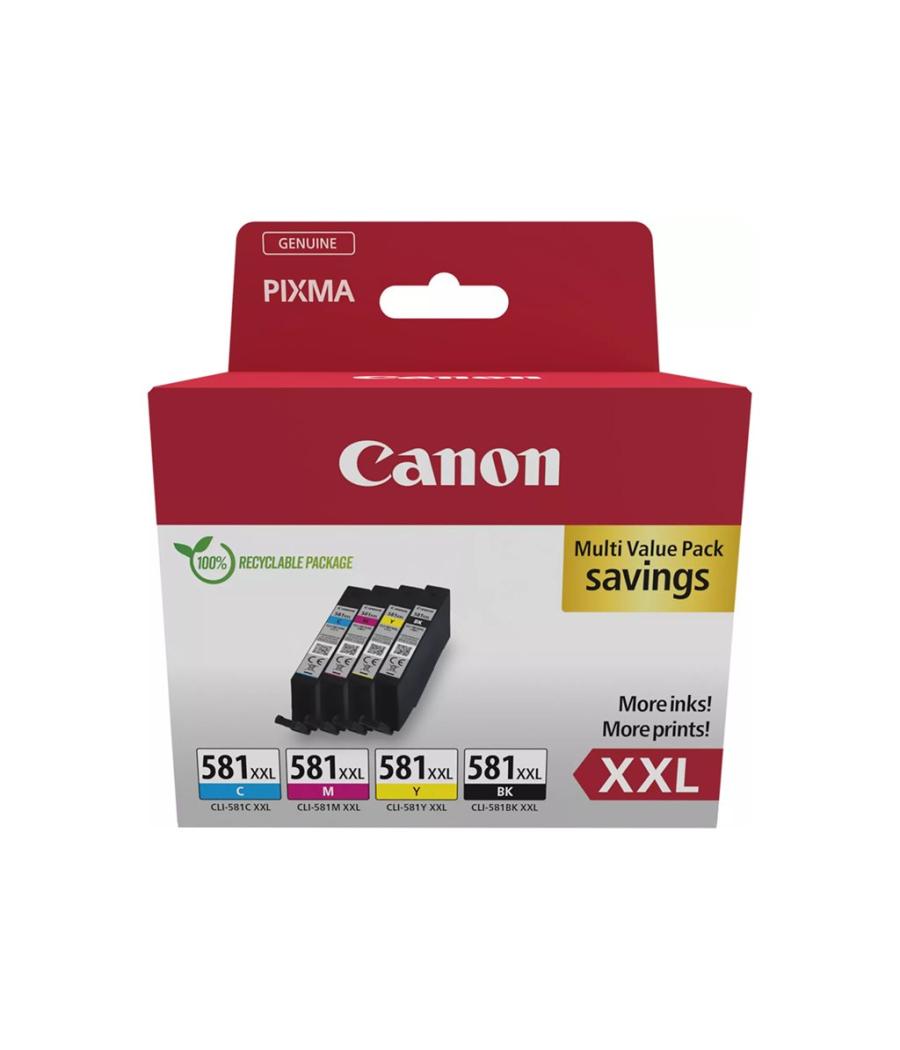 Cartouche d'encre Canon CLI-581XXL Original Multi Pack - Pack de 4 couleurs : Jaune, Cyan, Magenta, Noir - Consommable pour imprimantes : PIXMA TS6251, TS6350, TS6351, TS705, TS8252, TS8350, TS8351, TS8352, TS9550, TS9551 - Capacité : Taille XXL, 11.7 ml - EAN : 8714574679068.