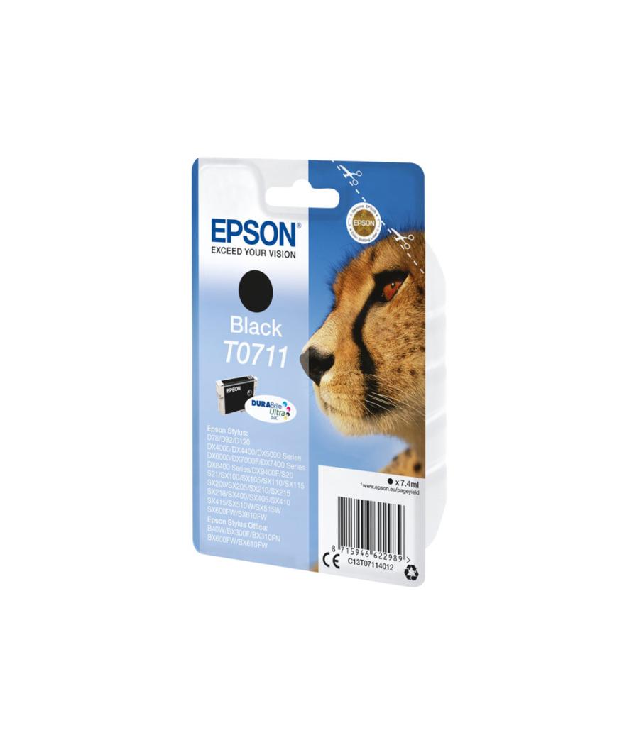 Cartouche d'encre Epson T0711 - Capacité : 7 ml - Couleur : Noir - original - Emballage coque avec alarme radioélectrique - Compatibilité : Stylus DX4400, DX4450, S20, S21, SX100, SX110, SX115; Stylus Office B40W - EAN : 8715946622996.