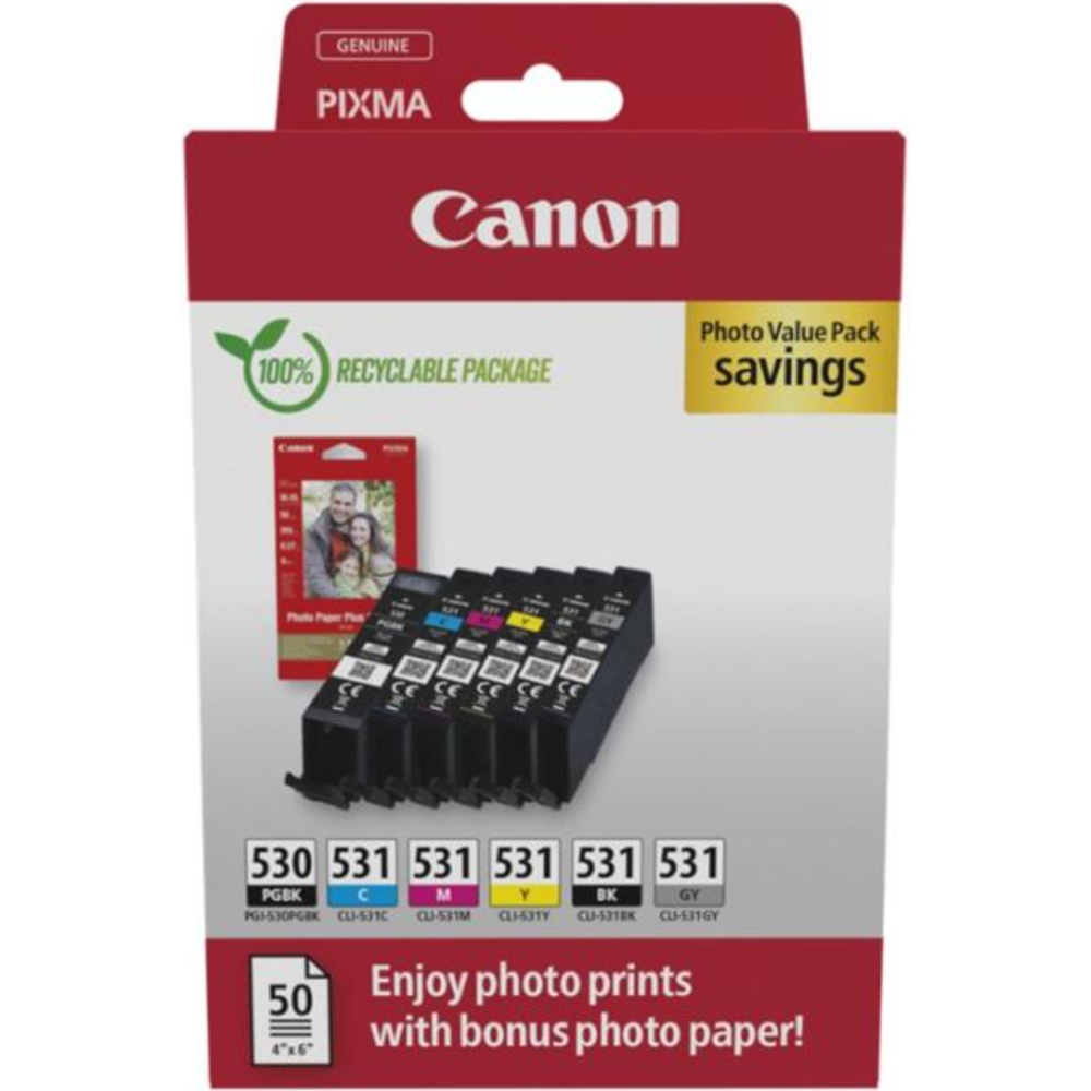 Canon PGI-530/CLI-531 PGBK/C/M/Y/BK/GY Photo Value Pack - Pack de 6 - noir pigment?, noir, cyan, magenta, jaune, gris - original - bo?te de suspension - jeu de papier / cartouche d'encre