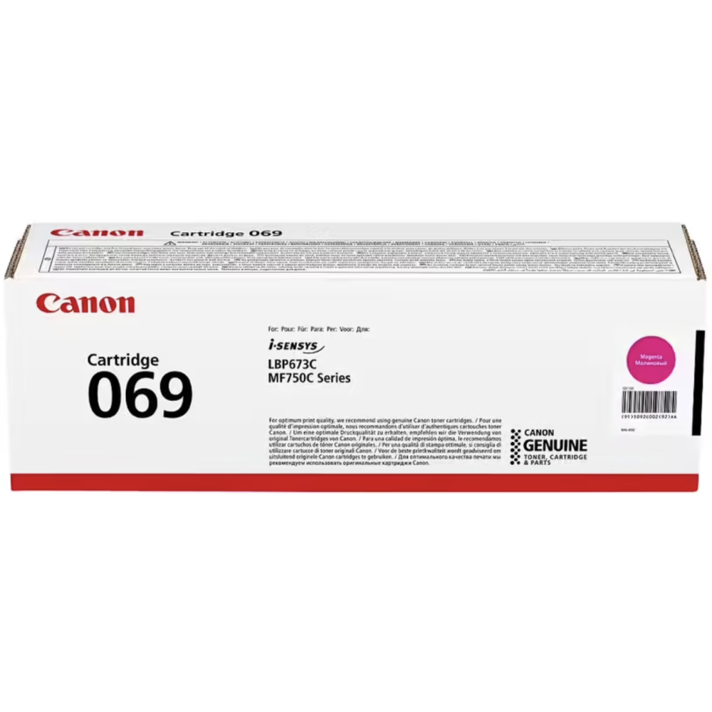 Cartouche de Toner (laser) Canon 069 Magenta - Marque : Canon - Référence fabricant : 5092C002 - Couleur : Magenta - Capacité : Standard – jusqu’à 1900 pages - Compatibilité : Canon i-SENSYS LBP673Cdw ; Canon i-SENSYS LBP673dw ; Canon i-SENSYS MF752Cdw ; Canon i-SENSYS MF754Cdw - Conformité : ISO/IEC 19798, RoHS 2011/65/EU, RoHS 2015/863/EU.