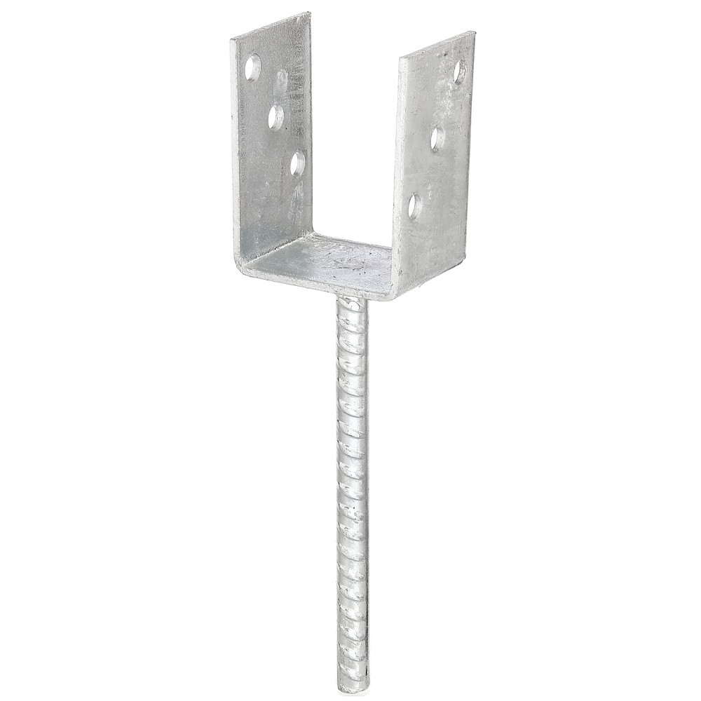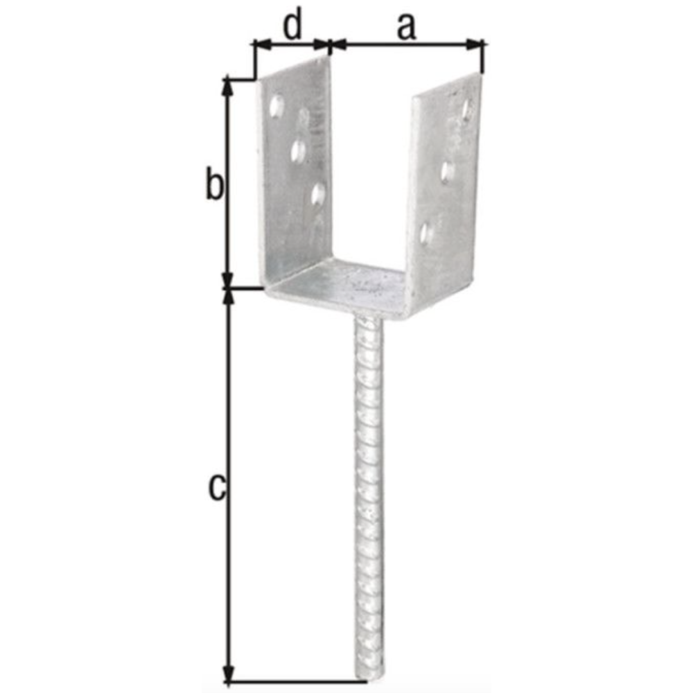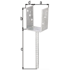 Ancre de poteau en U ALBERTS 214241 - Type de fixation : À sceller avec du béton - Matériau : Acier brut - Finition : Galvanisé - Dimensions : Cote a : 75 mm, Cote b : 104 mm, Cote c : 200 mm, Cote d : 60 mm - Diamètre de l'ancrage : 16 mm - Épaisseur : 4 mm - Nombre de trous : 6 - Diamètre des trous : 11 mm - Usage : Idéal pour les hautes clôtures tressées, les brises vue, ainsi que les constructions et clôtures en bois - Agrément technique européen : ETA-10/0210 (marquage CE) - EAN : 4004338214241.