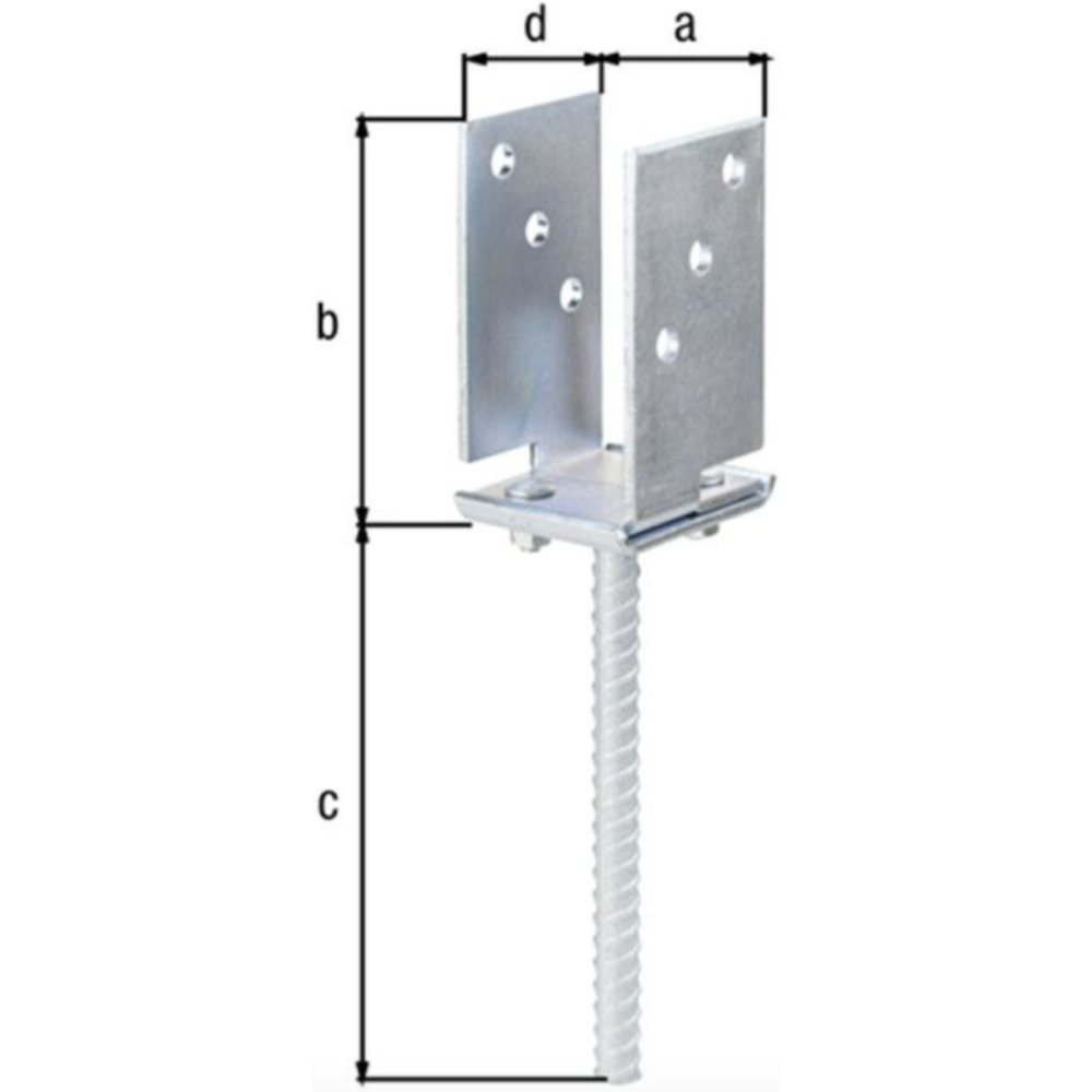 Ancre de poteau en U ALBERTS 214494 - Référence : 214494 - Marque : ALBERTS - Type de fixation : À sceller avec du béton - Matériau : Acier brut - Finition : Galvanisé passivé - Dimensions réglables : Largeur (Cote a) : 71 à 131 mm - Hauteur (Cote b) : 110 mm - Longueur (Cote c) : 200 mm - Profondeur (Cote d) : 70 mm - Diamètre de l'ancrage : 16 mm - Épaisseur : 5 mm - Nombre de trous : 6 - Diamètre des trous : 11 mm - EAN : 4004338214494.