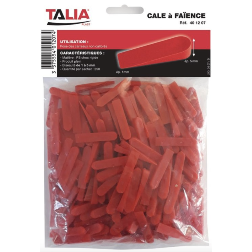 Cale à faïence biseautée Taliaplast 401207 - Cale pour la pose de carrelage - Forme biseautée, hauteur de 1 à 5 mm - Longueur : 30 mm - Largeur : 6 mm - Sachet : 250 pièces.
