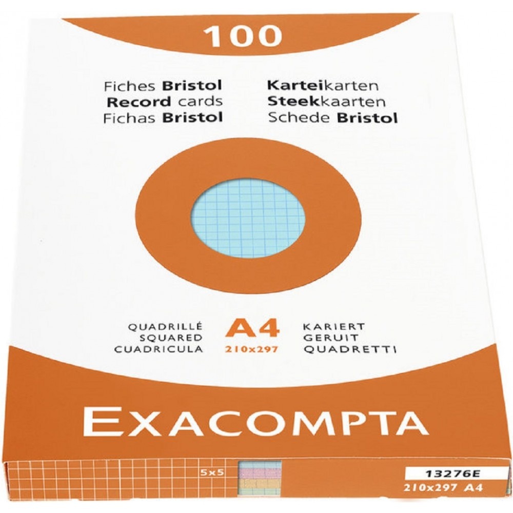 Fiche bristol EXACOMPTA étui de 100 fiches bristol non perforées carte forte 210 g couleurs assorties quadrillé 5x5 format 21 x 29,7 cm.