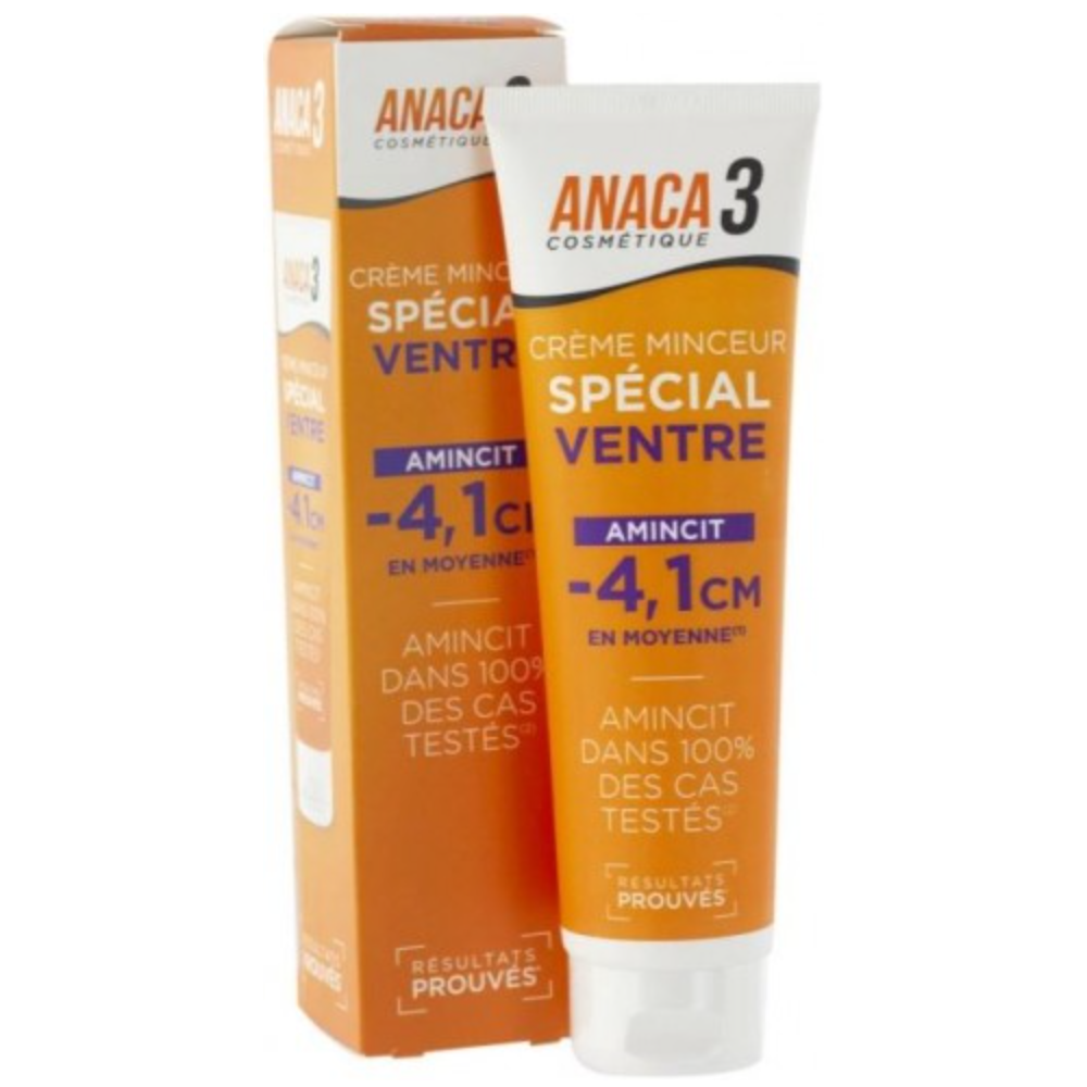 Crème minceur ventre Anaca 3 de conditionnement 150 ml - C'est un soin à l'action minceur ciblée ventre amincit - Permet de réduire de 4,1cm la circonférence de l'abdomen avec une utilisation biquotidienne pendant 8 semaines - Son action cosmétique ne comporte pas de perte de poids - Contient 97% d'ingrédients d'origine naturelle - Répond à la norme ISO 16128 - Résultats prouvés - Composition: Aqua, caprylic/capric triglyceride, glyceryl stearate, cetyl alcohol, stearyl alcohol, PEG-30 stearate, stearic acid, palmitic acid, phenoxyethanol, sodium hydroxide, capsaican, brassica alba sprout extract.