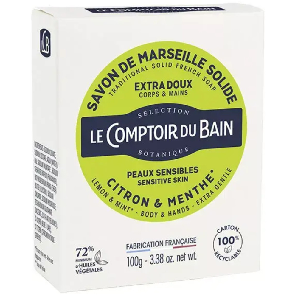 Le comptoir du bain savon de Marseille solide citron et menthe est un savon surgras qui convient aussi bien pour le corps que pour les mains. Il est adapté aux peaux sensibles et il peut être utilisé de façon répétée tout au long de la journée. Il nettoiera efficacement la peau, sans l'agresser, tout en délivrant un parfum tonifiant associant menthe et citron.