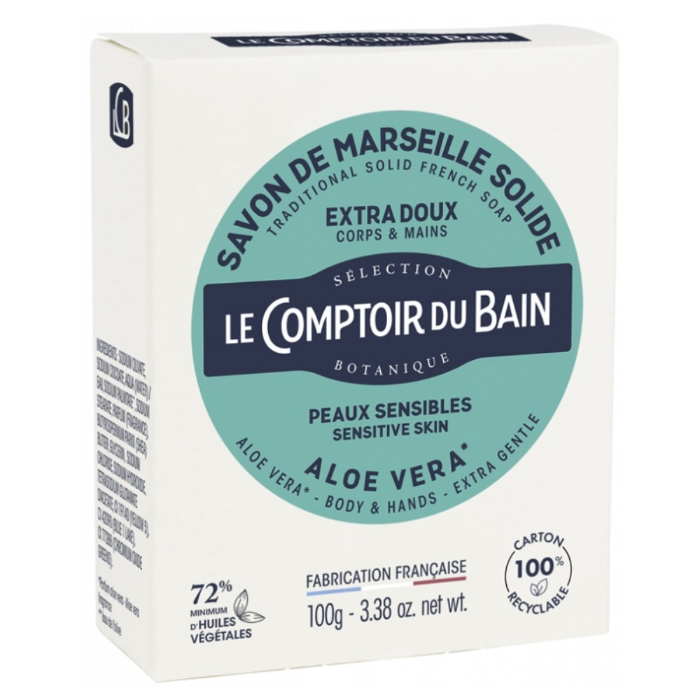 Composé de minimum 72% d'huiles d'olive et de coprah, le savon de Marseille solide surgras parfum Aloe Vera nettoie efficacement le corps et les mains tout en respectant la peau - Enrichi en beurre de karité et sans huile de palme, il laisse la peau douce et souple après usage - Parfum aloe vera frais et aquatique - Convient aux peaux sensibles et à un usage répété tout au long de la journée - Appliquer sur la peau humide, faire mousser puis rincer - Testé sous contrôle dermatologique.