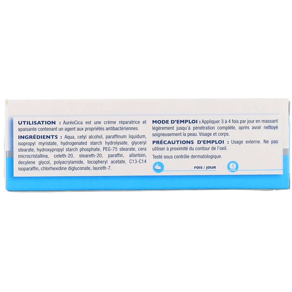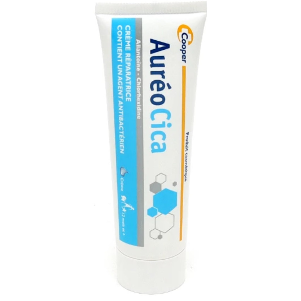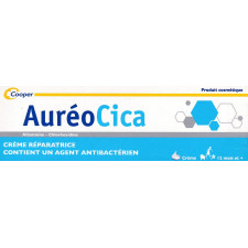 AureoCica est une crème réparatrice mise au point par le laboratoire Cooper - Ce produit cosmétique convient dès 12 mois pour le traitement des plaies, et plus précisément pour la phase de cicatrisation - La crème réparatrice AureoCica a été développée dans le but de soutenir et accélérer le processus de régénération cutanée suite à une petite plaie superficielle. Elle contribue également à protéger les plaies risquant de s'infecter grâce à sa formule contenant de la chlorhexidine, un agent antibactérien et antiseptique local. La crème AureoCica contient aussi de l'allantoïne, connue pour ses propriétés apaisantes. Elle permet d'atténuer les sensations d'inconfort qui peuvent accompagner la cicatrisation, comme les démangeaisons et les tiraillements par exemple...