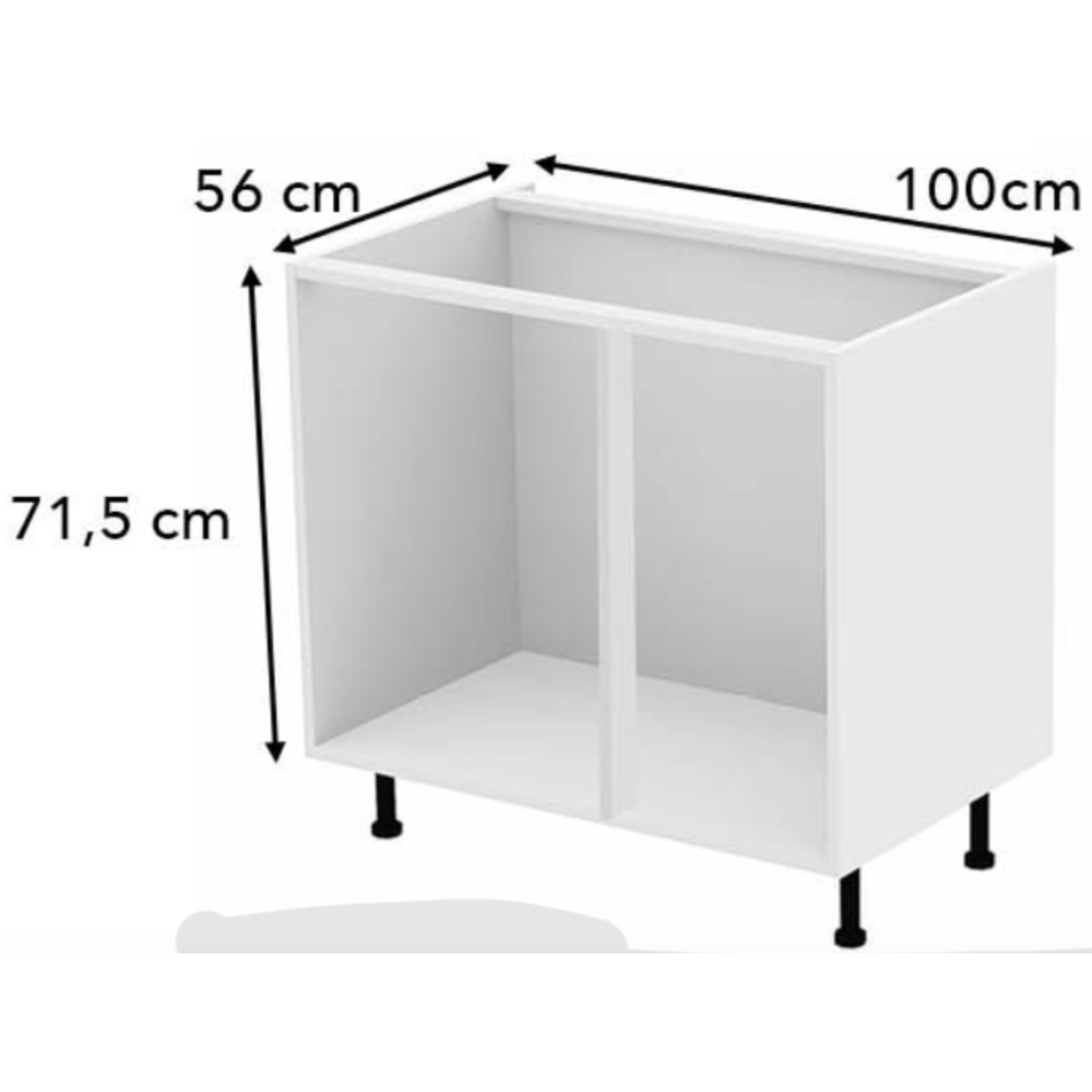 Caisson blanc angle bas RB System CA3BLA7131000BA - Hauteur 71,5 cm - Largeur : 100 cm - Profondeur : 56 cm - Hauteur totale avec pieds : 84,5 cm à 89,5 cm - Matériau : Panneaux de particules 16 mm - Épaisseur des chants : 0,8 mm - Coloris : Blanc - Fond arrière : Isorel 3 mm - Assemblage : Vis et chevilles - Vide sanitaire : 50 mm - Pieds réglables : 14 cm à 18 cm, avec vis et support de fixation de la plinthe - Pré-percé : Pour charnières - Quincaillerie : Vis d'assemblage : 10 vis + outil de serrage ; Tourillons : 10, diamètre 8 mm ; Caches vis : 10 .