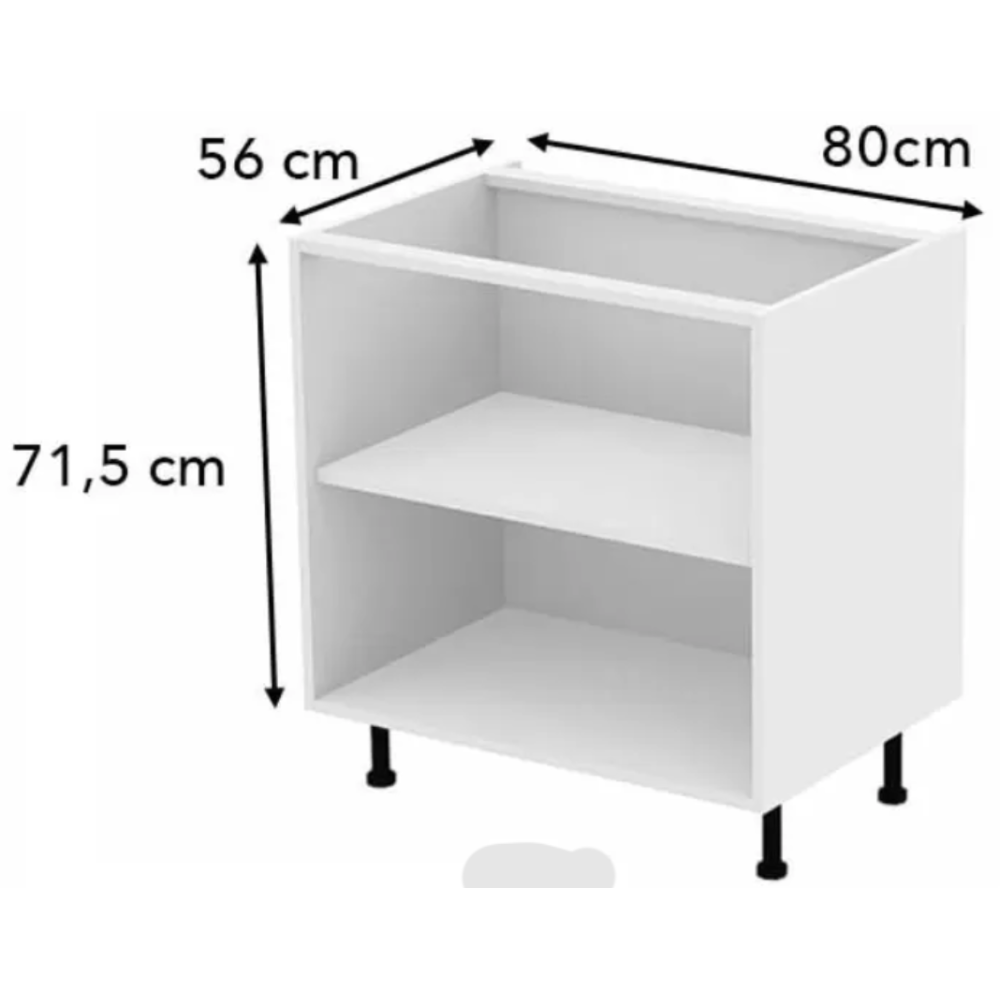 Caisson de cuisine bas RB System CA3BLA713800B - Hauteur : 71,5 cm - Largeur : 80 cm - Profondeur : 56 cm -Hauteur totale avec pieds : 85,5 cm à 89,5 cm - Panneaux de particules épaisseur 16 mm - Coloris : Blanc - Composition : 1 étagère réglable (pré-percée) ; 1 fond arrière isorel 4 mm ; Assemblage par vis et chevilles ; Vide sanitaire 50 mm ; Pré-percés pour fixation des charnières et/ou coulisses ; Plan de montage inclus.