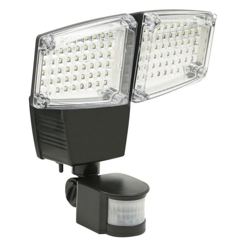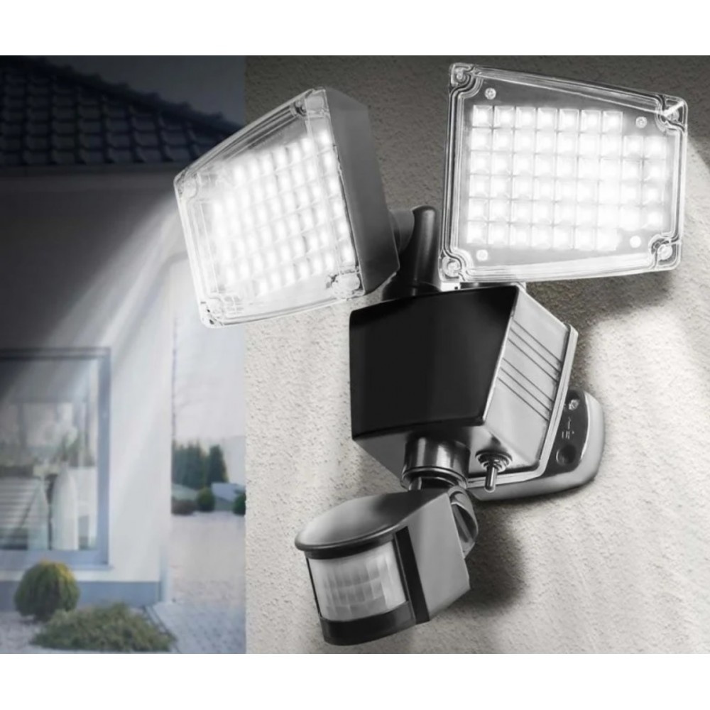 Double projecteur led mural avec détecteur de mouvements. Ce projecteur 100 led d'une puissance de 1100 lumens se positionne idéalement en extérieur afin d'éclairer un garage, une allée ou une entrée à la nuit tombée. Il dispose de deux têtes inclinables ce qui permet d'éclairer exactement l'endroit souhaité lors d'un passage devant son détecteur de mouvements dont l'angle de détection est de 180°.