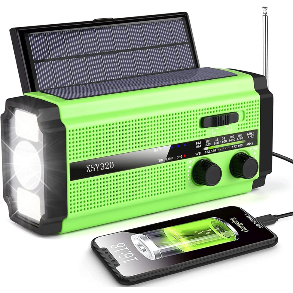 Radio torche d'urgence à dynamo portable permet d'écouter votre station de radio préférée, mais aussi de suivre les dernières prévisions météorologiques tout en étant protégé des intempéries telles que les ouragans, les tornades et les tempêtes de neige - Dispose de 3 modes de chargement - Est équipée d'une batterie de 5000mAh et prend en charge le chargement USB, le chargement solaire et le chargement manuel par manivelle - Peut être rechargée à tout moment et n'importe où - Est équipée d'une alarme SOS et peut activer une sirène et une lampe torche en cas d'urgence - Etanche IPX3 parfaitement adaptée aux activités de plein air.