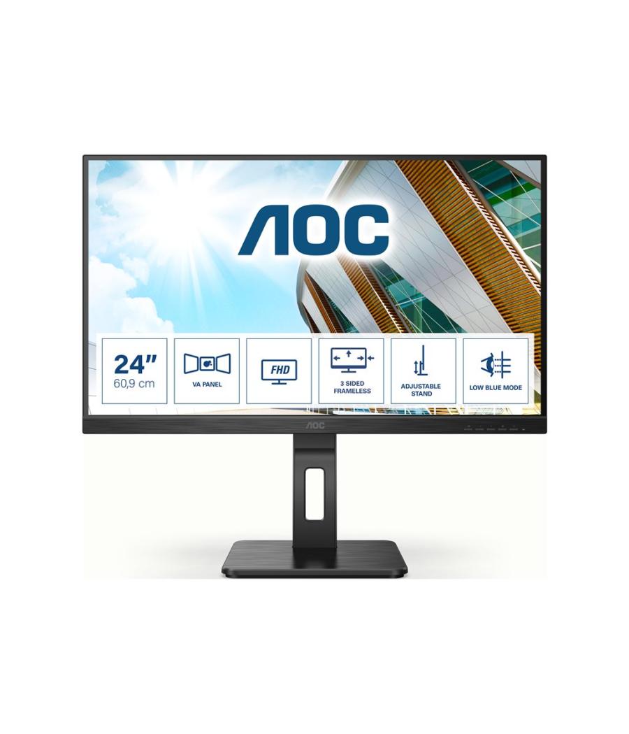 | L'AOC 242P2QM est un panneau VA de 23,8 pouces, avec une résolution FHD et des détails nets et profonds, maintenu dans un châssis sans cadre à trois côtés que vous pouvez régler, pivoter et incliner selon vos besoins de confort au cours de longues heures de travail. Agréable à œil avec l'anti-éblouissement, le mode faible lumière bleue et Adaptive-Sync pour éviter le flou. Connectivité essentielle mais complète. |