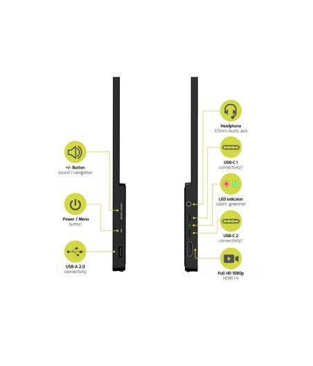 | Le moniteur portable LCD 15.6" 902101 de PORT Connect est le compagnon de voyage idéal, grâce à son format ultrafin et léger. Profitez d'une résolution d'image Full HD jusqu'à 1080p pour un confort visuel optimal. L'écran IPS (In-Plane-Switching) permet un affichage plus net et plus précis. Profitez d'un contraste et d'une qualité de couleur améliorés grâce à la technologie HDR (High Dynamic Range). En branchant l'écran sur le secteur, vous pouvez également alimenter votre ordinateur portable jusqu'à 65 W via le port USB-C Power Delivery. Connectez votre ordinateur à l'écran via un simple câble HDMI ou USB-C. L'installation Plug-and-Play est automatique, aucun pilote n'est nécessaire. Bénéficiez d'une connectivité supplémentaire avec 2 ports USB-A 2.0 pour connecter des périphériques supplémentaires tels que des clés USB, des disques durs externes, une souris, un clavier, etc. et une prise audio de 3,5mm pour les haut-parleurs ou les écouteurs. Des boutons de réglage à accès rapide sont disponibles sur les commandes latérales. Des haut-parleurs sont intégrés pour participer à des réunions en ligne ou regarder des vidéos. Un support au dos de l'écran est intégré pour régler l'inclinaison en position verticale. Pour une utilisation universelle, plusieurs langues sont disponibles dans les paramètres de l'écran: Anglais, français, allemand, espagnol, hongrois, russe et slovène. | |