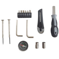 Multifonction - Cette lanterne renferme dans son corps une mini boîte à outils idéale pour toutes les petites interventions du quotidien - Vous pourrez faire vos petites réparations avec une lumière puissante - Contient : 1 cutter (L. 9 cm) - 1 boussole - 2 clés allen - 1 tournevis 6 embouts (3 embouts plat 4/5/6, 2 embouts cruciforme PH1/PH2 et 1 adaptateur douilles) - 2 douilles (7 et 8 mm) - 2 tournevis de précision (1 cruciforme et 1 plat) - Alimentation : x3 piles LR06 (non incluses) - Éclairage : 6 LED blanches et 4 LED rouges - Modes d'éclairage : blanc fixe ou rouge clignotant.