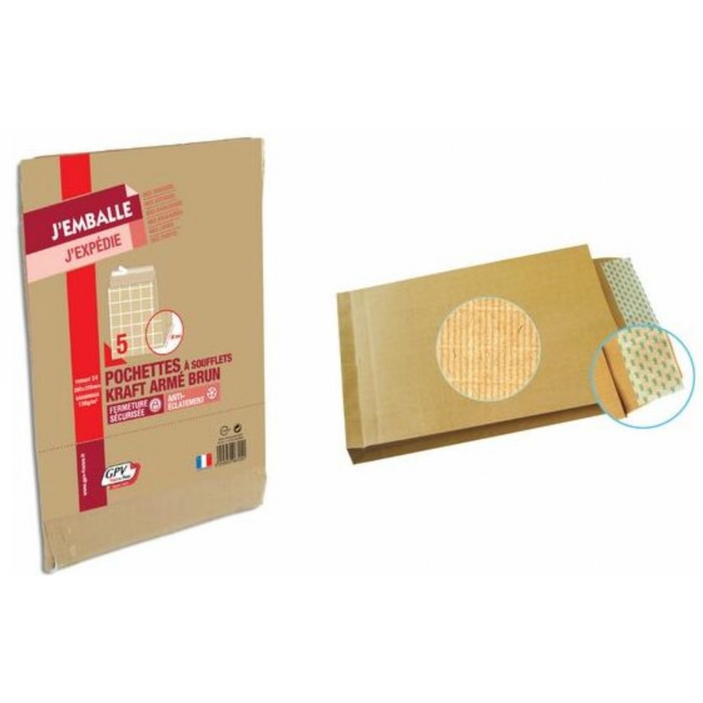 Paquet de 50 pochettes kraft armé 229x324 130g m² bande de protection. La pochette en Kraft armé est conçue pour assurer l'envoi de produits lourds, qui nécessitent une protection renforcée. Résistance supérieure dues à sa structure : entre deux épaisseurs de kraft, l'armature polyester quadrillée donne de la solidité et le film polyéthylène protège de l'humidité.
