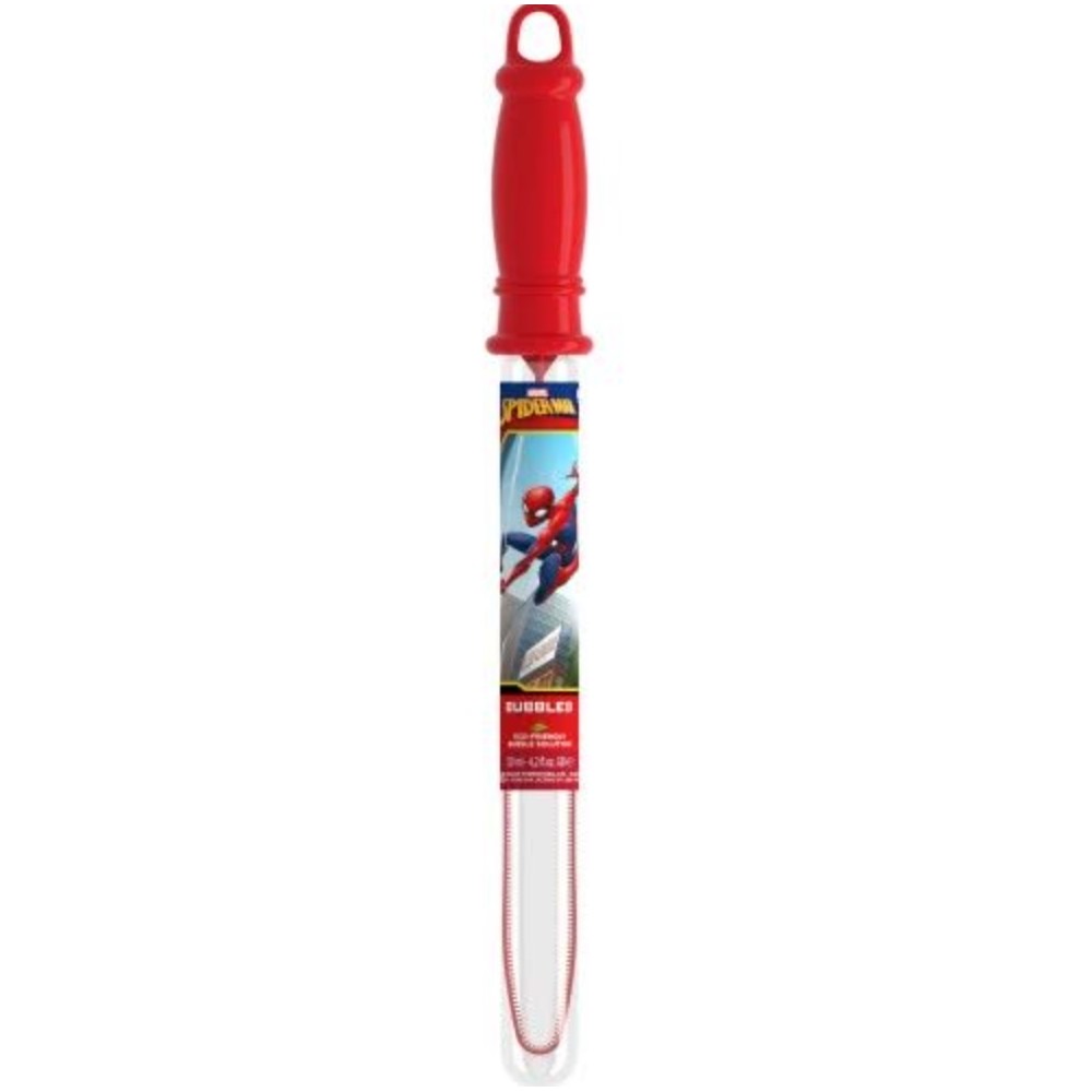 Un sabre de bulles de savon Spiderman pour s'amuser avec ses amis, avec un jeu de patience sur le couvercle pour continuer à jouer tout seul quand ils sont partis.