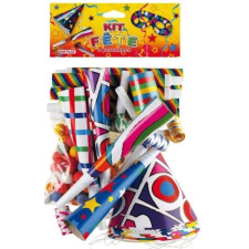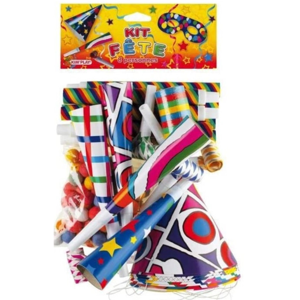 Kit pour faire la fête pour 8 personnes : 8 chapeaux cartons avec élastique 16 cm de haut et 10.5 cm de diamètre. 8 sarbacanes carton 18.5 x 2 cm. sachet de boules (environ 40)1 lot de 8 serpentins. 8 trompettes 18.8 cm x 4 cm. 8 langues de belle mère (29 cm dépliées).