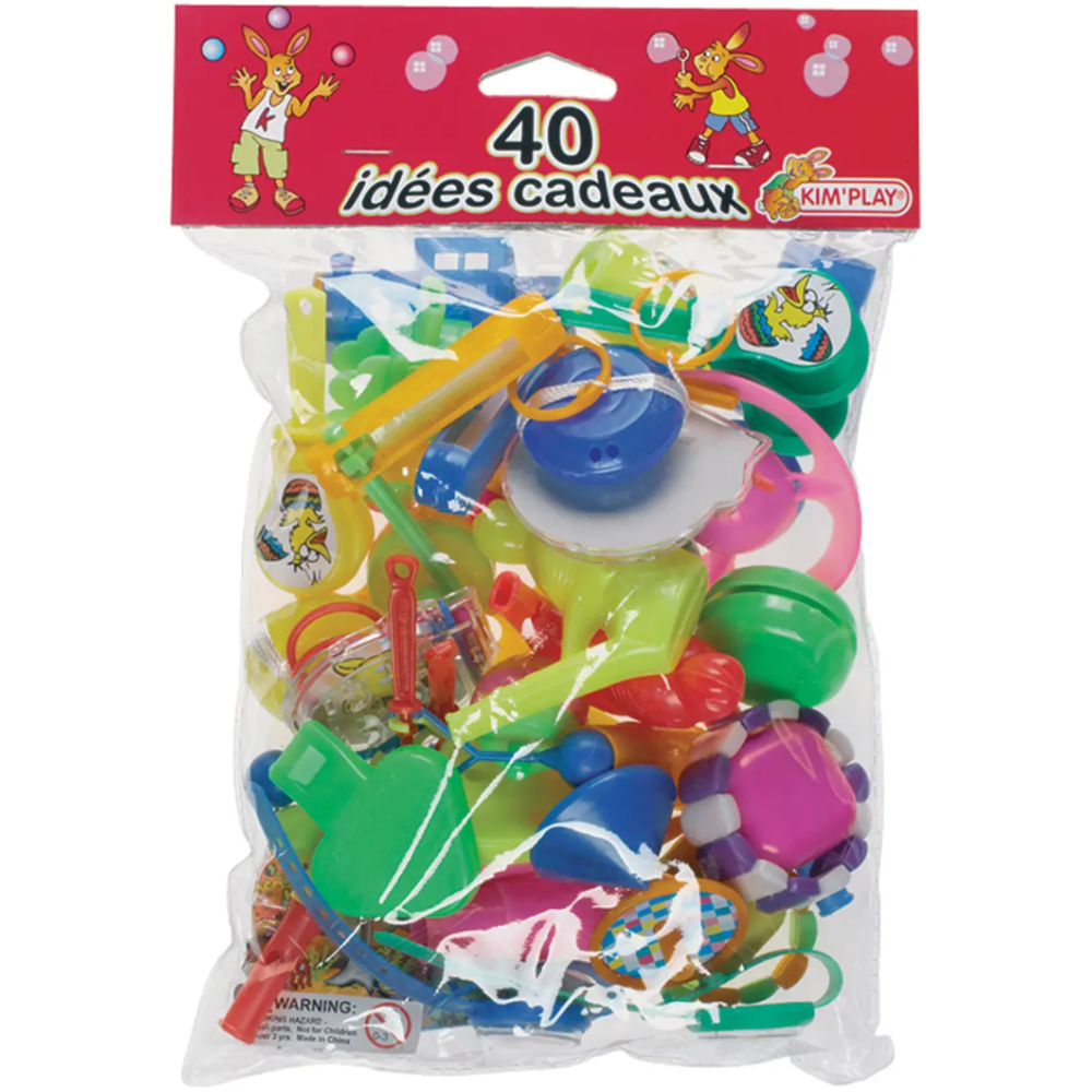 Sachet 40 idées cadeaux kim’play composé d’accessoires divers comme des bracelets, des bateaux, des oiseaux ou des montres - Affiche une grande praticité grâce à la possibilité de l’utiliser dans les jeux de pêche à la ligne ou pour garnir des piñatas - Présente un design transparent qui permet d’entrevoir la multitude de petits jouets amusants - Fait 120 grammes comme poids pour 20.5 cm de long, 14 cm de large et 3.5 cm de haut - Arbore des couleurs bariolées qui pourront captiver l’intérêt des enfants de 3 ans et plus.