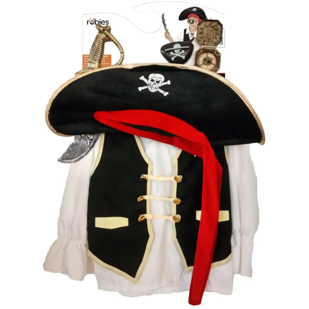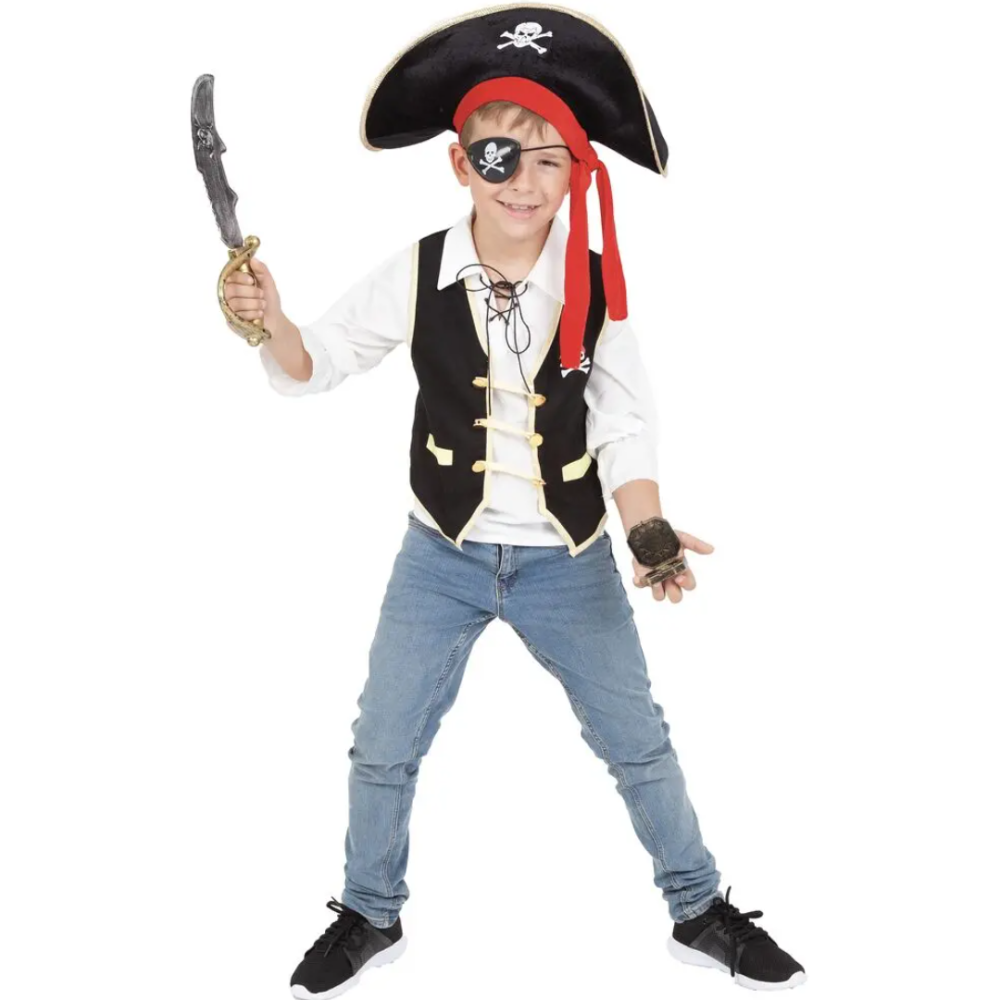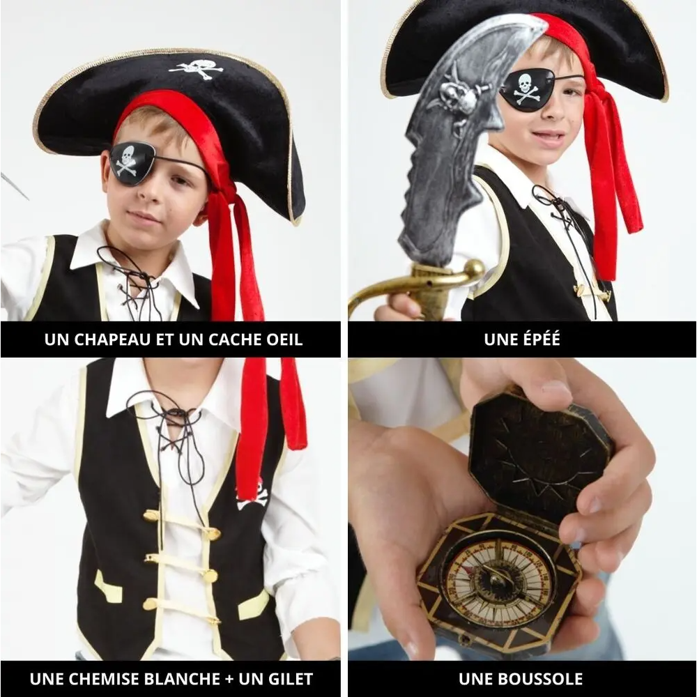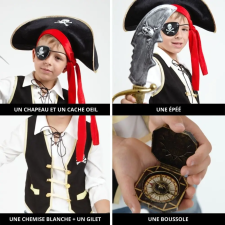 Ensemble déguisement Top et accessoires pirate taille 5-8 ans pour permettre aux tout-petits de découvrir le plaisir de l'aventure - Choix idéal pour toute occasion spéciale ou pour jouer à la maison - Conçu pour éveiller l'imagination des jeunes explorateurs - Qualité et confort au rendez-vous - Motifs marins présents sur le top, pratiques pour un jeu de rôle - Plusieurs accessoires inclus: un chapeau de pirate, un foulard coloré , une boussole et une épée en plastique - Recommandé aux 5 ans et plus - Irait bien pour un anniversaire à thème.