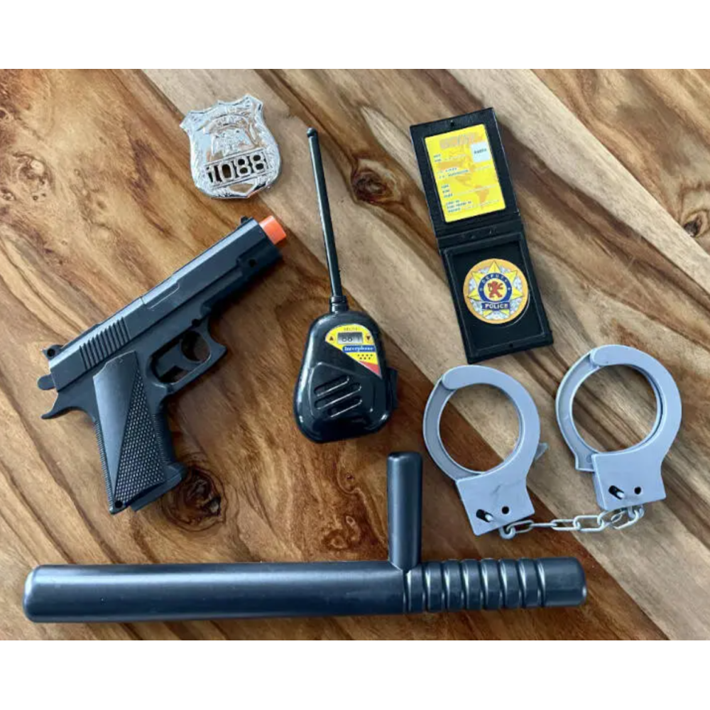 Set de policier, des accessoires de jeu qui permettent le temps d'un divertissement de devenir un vrai policier - Contient 1 paire de menottes, 1 insigne de policier, 1 porte insigne de policier, 1 talkie-walkie, 1 matraque et 1 pistolet - Armes factices en plastique - Jeu pour les enfants de 3 ans et plus - Des accessoires qui aident à stimuler l'imagination de votre enfant et lui permettent de compléter son déguisement afin d'inventer plein d'aventures.