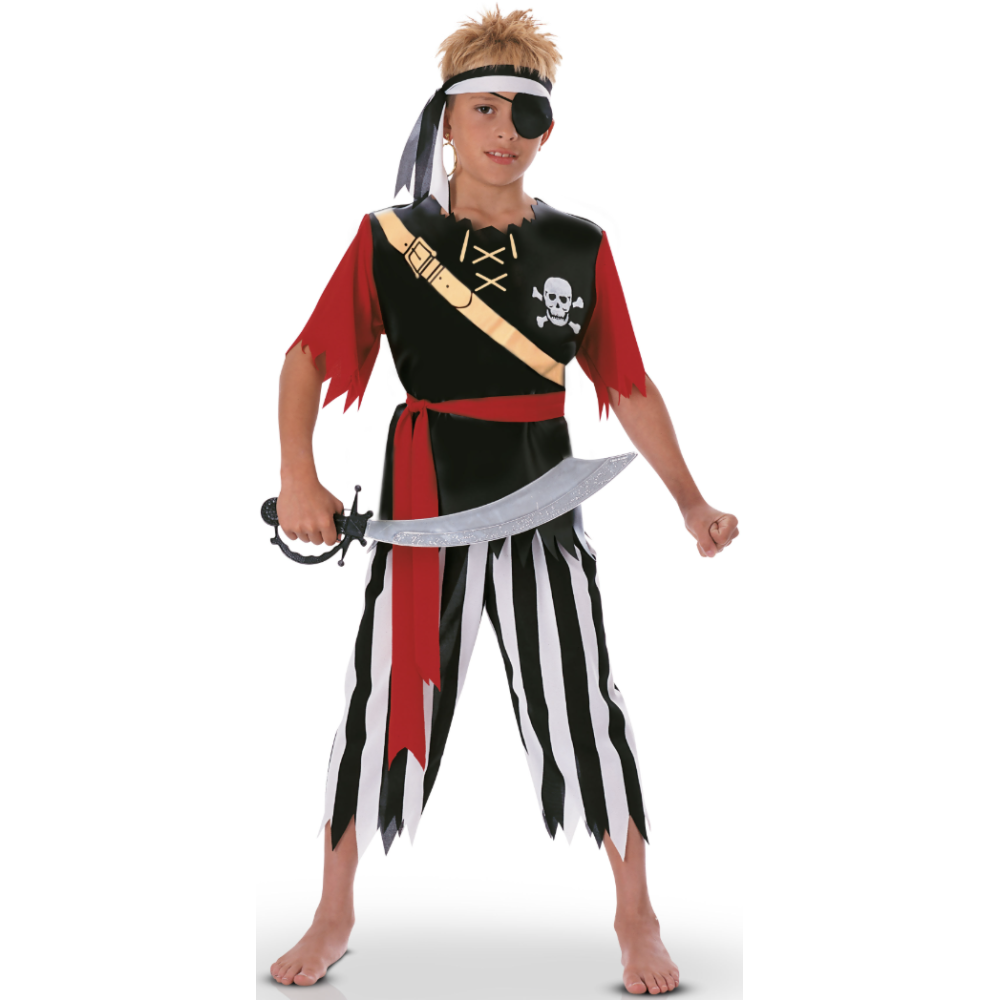 Déguisement pirate enfant (8–10 ans) Taille L - Marque : Rubie's - Taille : 122 à 128 cm - Contenu : Top imprimé rouge et noir, Pantalon rayé noir et blanc, Bandeau rayé noir et blanc, Ceinture rouge en tissu - Accessoires non inclus : Sabre, cache-œil - Packaging : Housse - Thème : Déguisement entrée de gamme - EAN : 3527079072129.