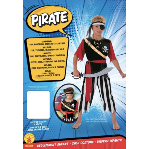 Déguisement pirate enfant (3–4 ans) Taille S - Marque : Rubie's - Contenu : Top imprimé rouge et noir, Pantalon rayé noir et blanc, Bandeau rayé noir et blanc, Ceinture rouge en tissu - Accessoires non inclus : Sabre, cache-œil - Packaging : Housse - Thème : Déguisement entrée de gamme - EAN : 3527079072105.
