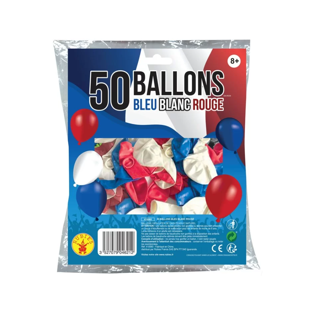 Sac de 50 ballons - Rubie's - 100% latex de caoutchouc naturel - bleu/blanc/rouge - Offre une décoration de salle festive ou élégante - dès 3 ans - EAN 3527079046212.