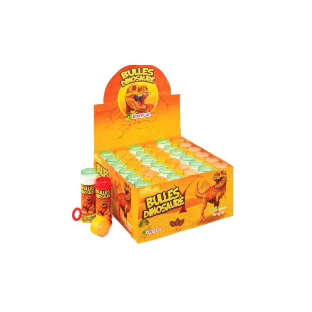 Bulles de savon dinosaure - Kim'Play - 36 tubes de 60 millilitres en plastique léger - Disposent d'une baguette intégrée dans chaque tube - Idéal pour les anniversaires, fêtes et kermesses - Format individuel pratique pour une distribution - Design ludique - Facile à stocker et empiler - dès 3 ans - 3225430991903.