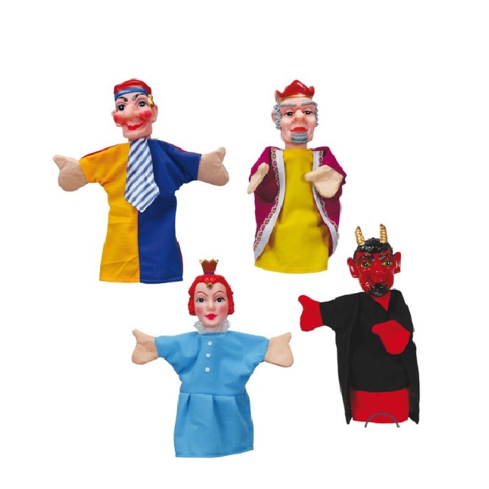 Set 4 marionnettes à main. Avec : 1 clown, 1 roi, 1 princesse et 1 diable. En plastique et tissu (100% polyester).