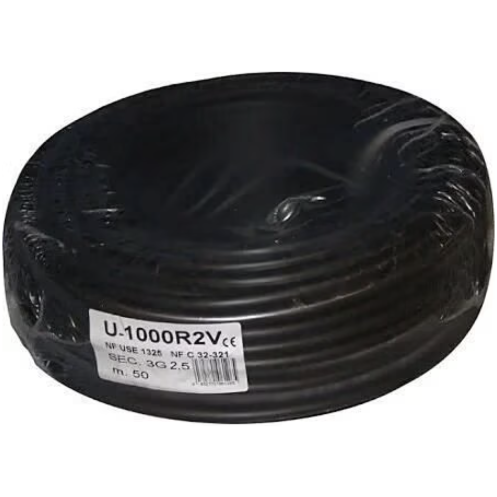 Câble électrique U 1000 R2V - Caractéristiques : 3G2,5 mm² - Tension maximale : 1000V - Conditionnement : Livré en couronne de 50 m - Poids : 2.625 kg - Couleur : Noir.
