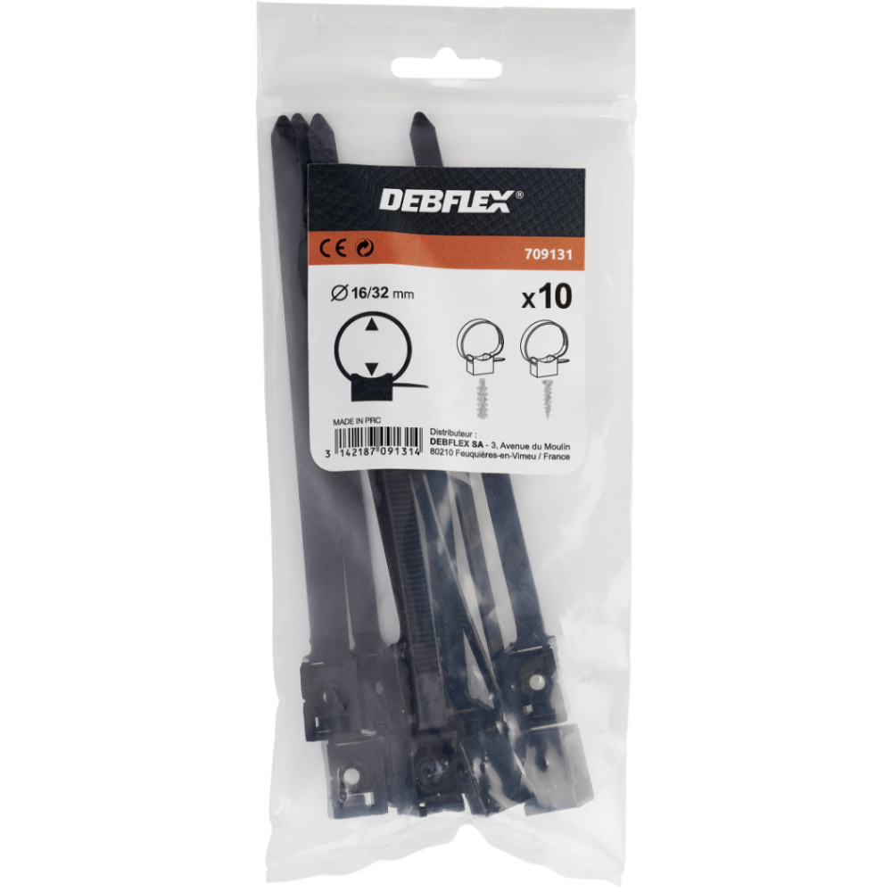 Collier de serrage DEBFLEX - avec embase pour fixation sécurisée sur surfaces planes - Diamètre ajustable : 16 à 32 mm - Matériau : Nylon haute résistance, résiste à chaleur, humidité et vibrations - Système autobloquant pour un maintien sûr - Installation facile : serrage manuel, ajustable avec pince coupante - Fixation de l’embase : vis ou adhésif (non fournis) - Couleur : noir - Conditionnement : sachet de 10 colliers.