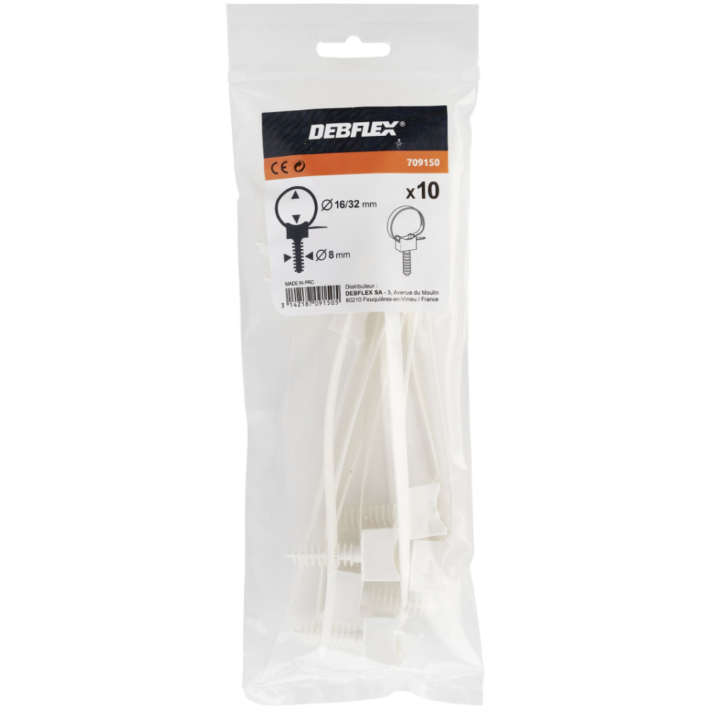 Sachet avec accroche - Contient 10 colliers de serrage - Marque : Debflex - Avec embases - Couleur : Blanc - Référence / code-barres : 3142187091505.