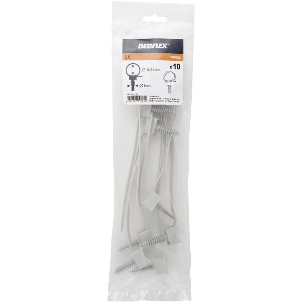 Sachet avec accroche - Contient 10 colliers de serrage - Marque : Debflex - Avec embases - Couleur : Blanc - Référence / code-barres : 3142187091505.