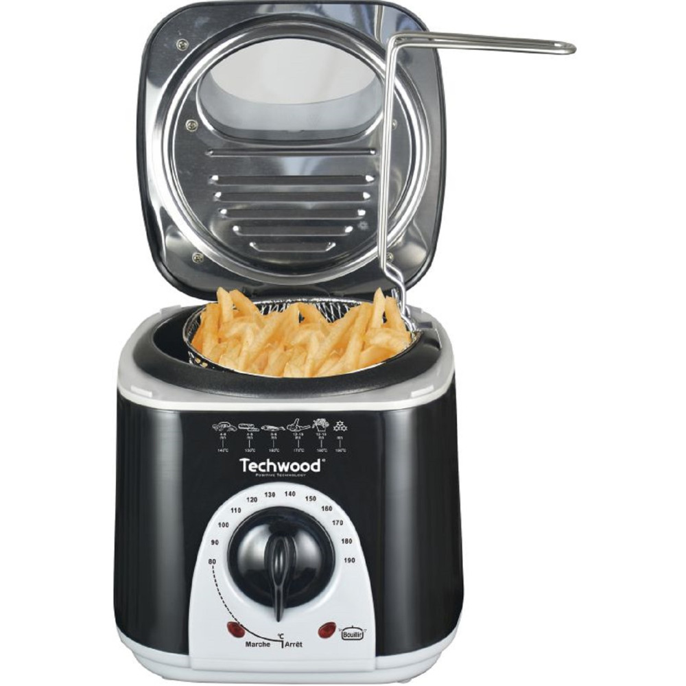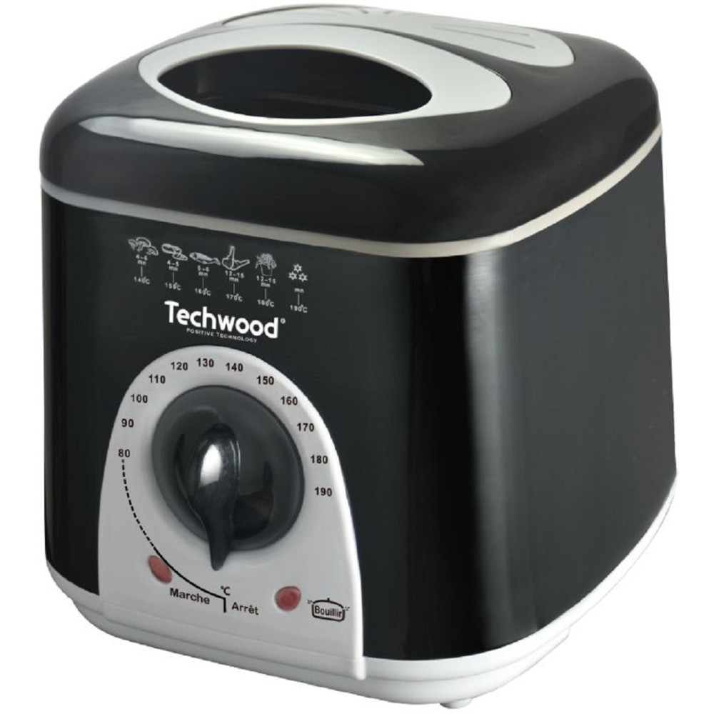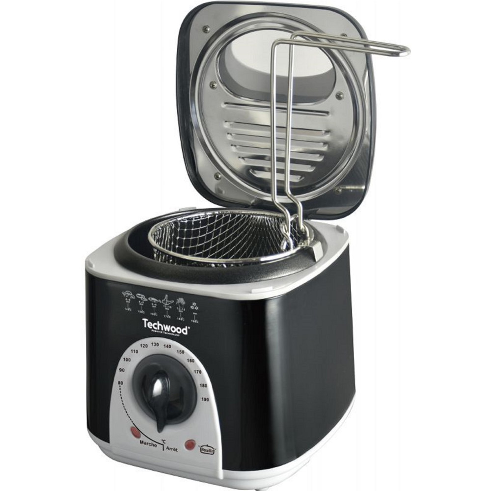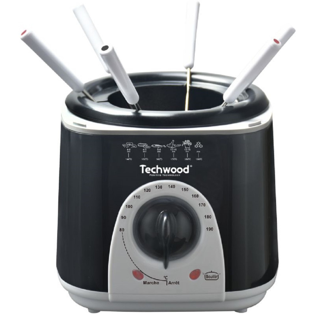 Appareil à fondue 2 en 1 Techwood coloris noir - Peut être utilisé comme appareil à fondue et comme friteuse - Equipé d'un couvercle détachable - Livré avec un panier à friture-poignée détachable et 6 pics à fondue - Dispose d'un bac à huile de capacité 1 litre - Thermostat réglable de 80° à 190°C - 2 témoins lumineux intégrés: témoin lumineux de chauffe et témoin lumineux de mise en forme - Protection thermique par fusible intégrée - Alimentation 220-240V/50-60Hz - Puissance de l'appareil 950watts - Poids 1,416kg et dimensions 22x19,5x20,5 cm.