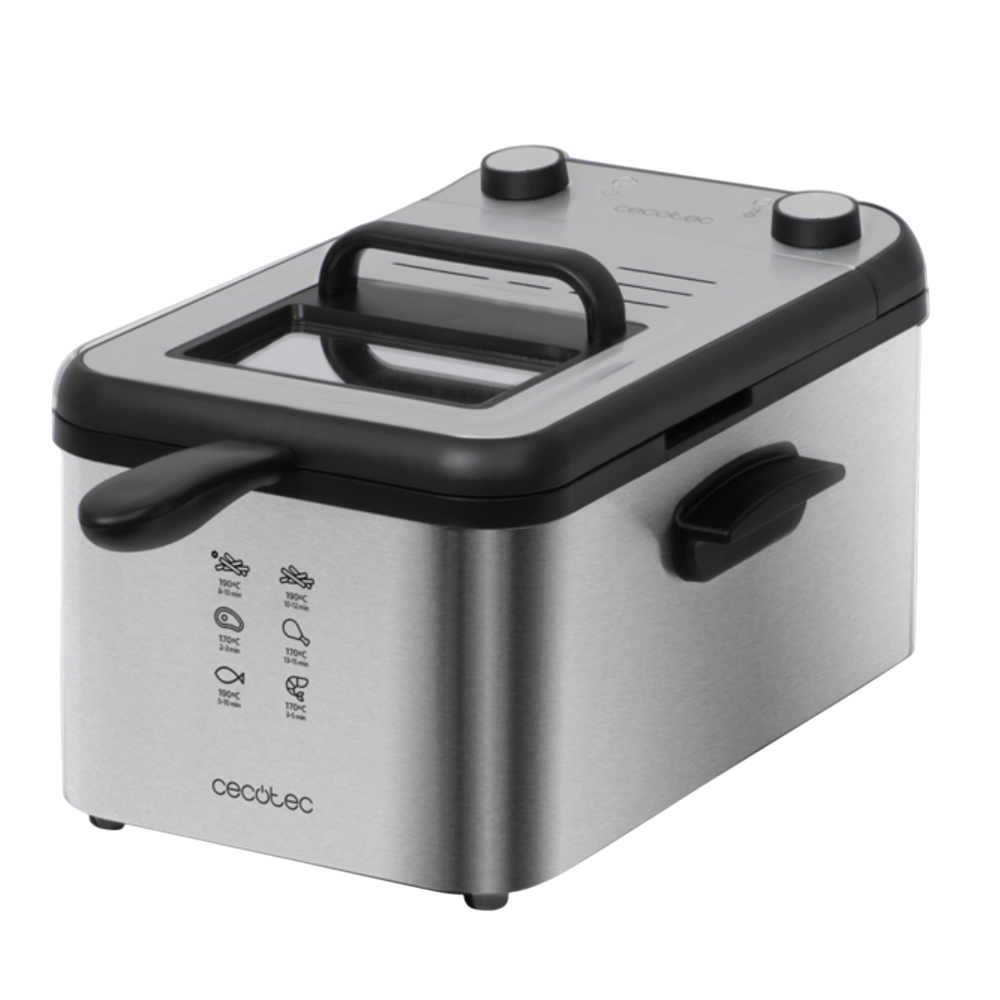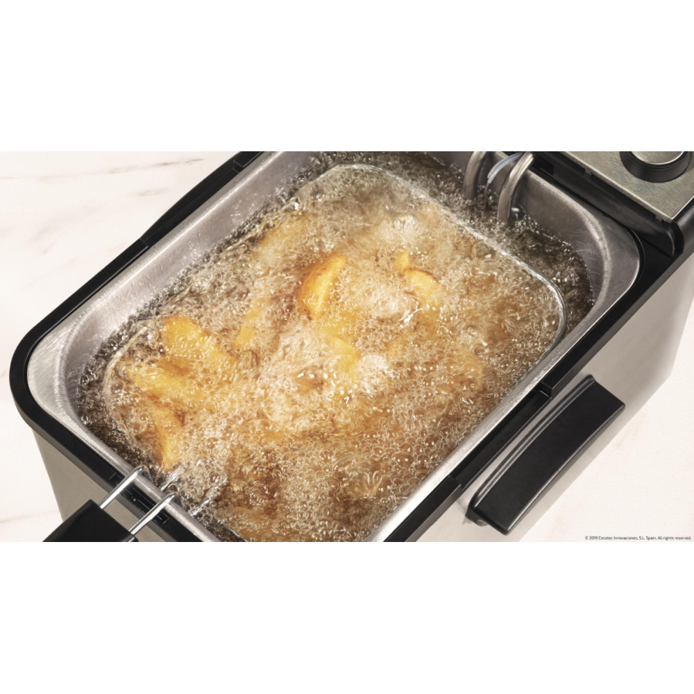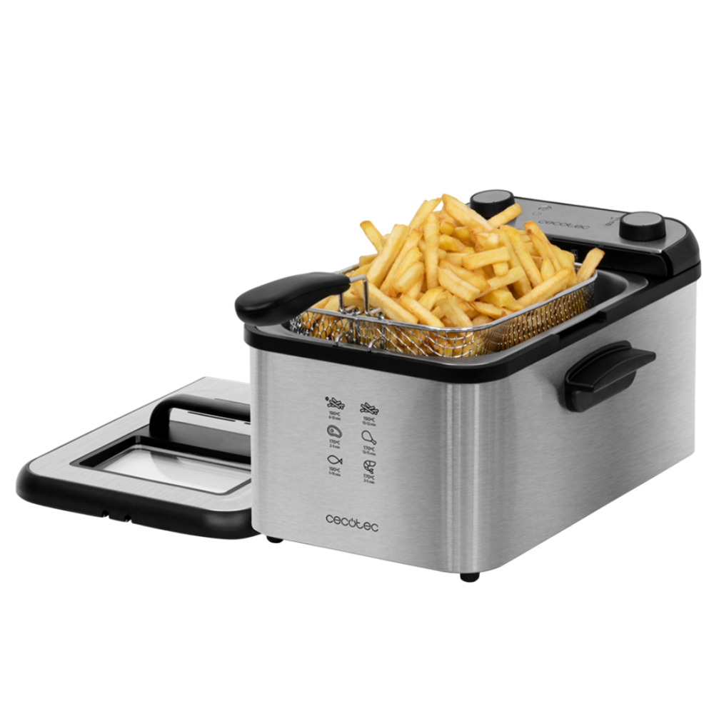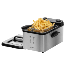 Friteuse sans huile CecoFry Cecotec dotée d'un thermostat pour régler la température entre 80 et 200°C - Conçue dans un design élégant incluant des finitions en acier inoxydable - Permet de cuisiner avec 1 seule cuillère d’huile - Dispose d'un récipient d'une contenance de 5.5 litres pour cuisiner - Équipée d'un moteur d'une puissance de 1700 Watts - Intègre un minuteur allant jusqu'à 60 minutes - Dimensions : 26 cm x 31,6 cm x 30,5 cm – Poids de l'article 4 kg.