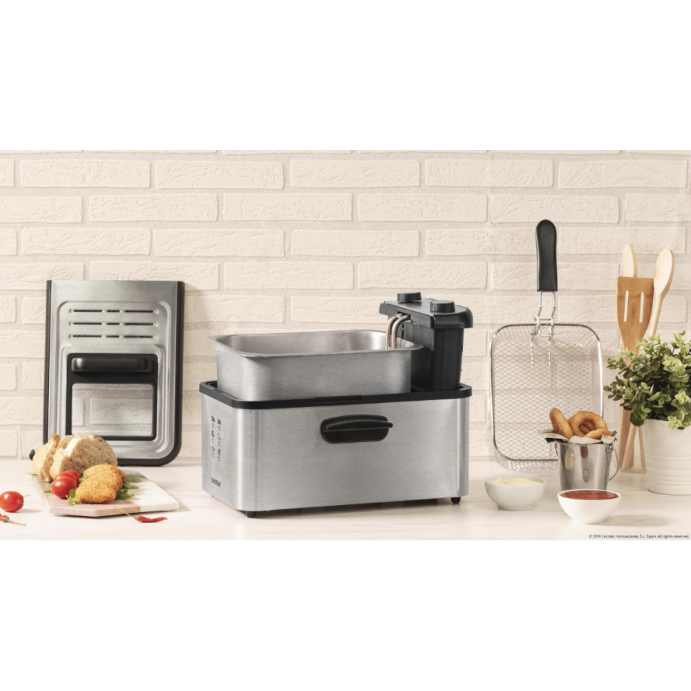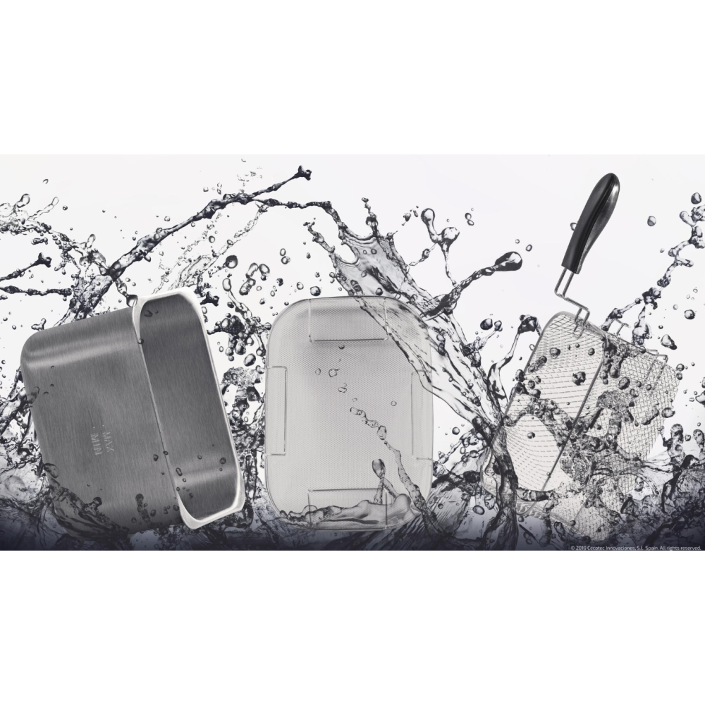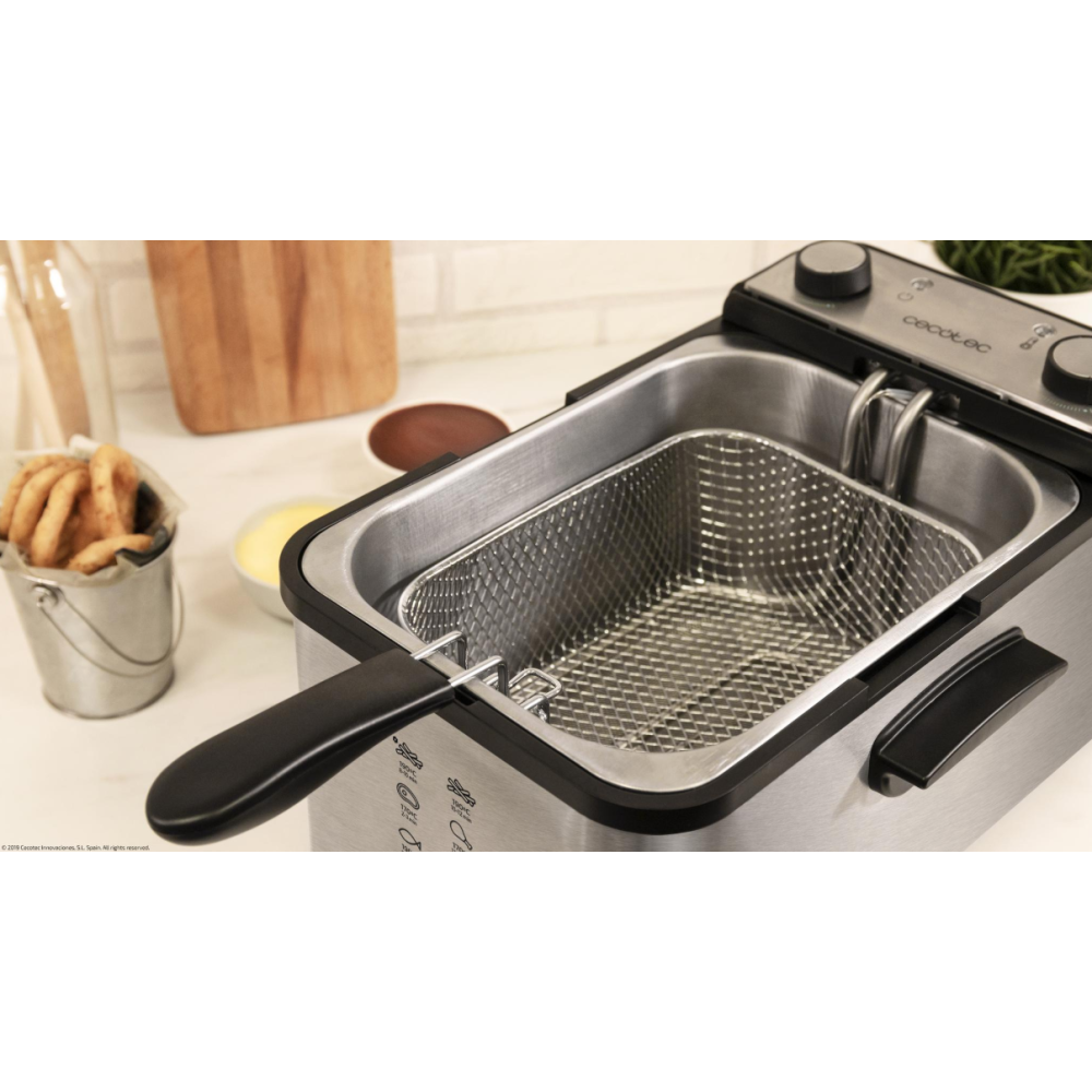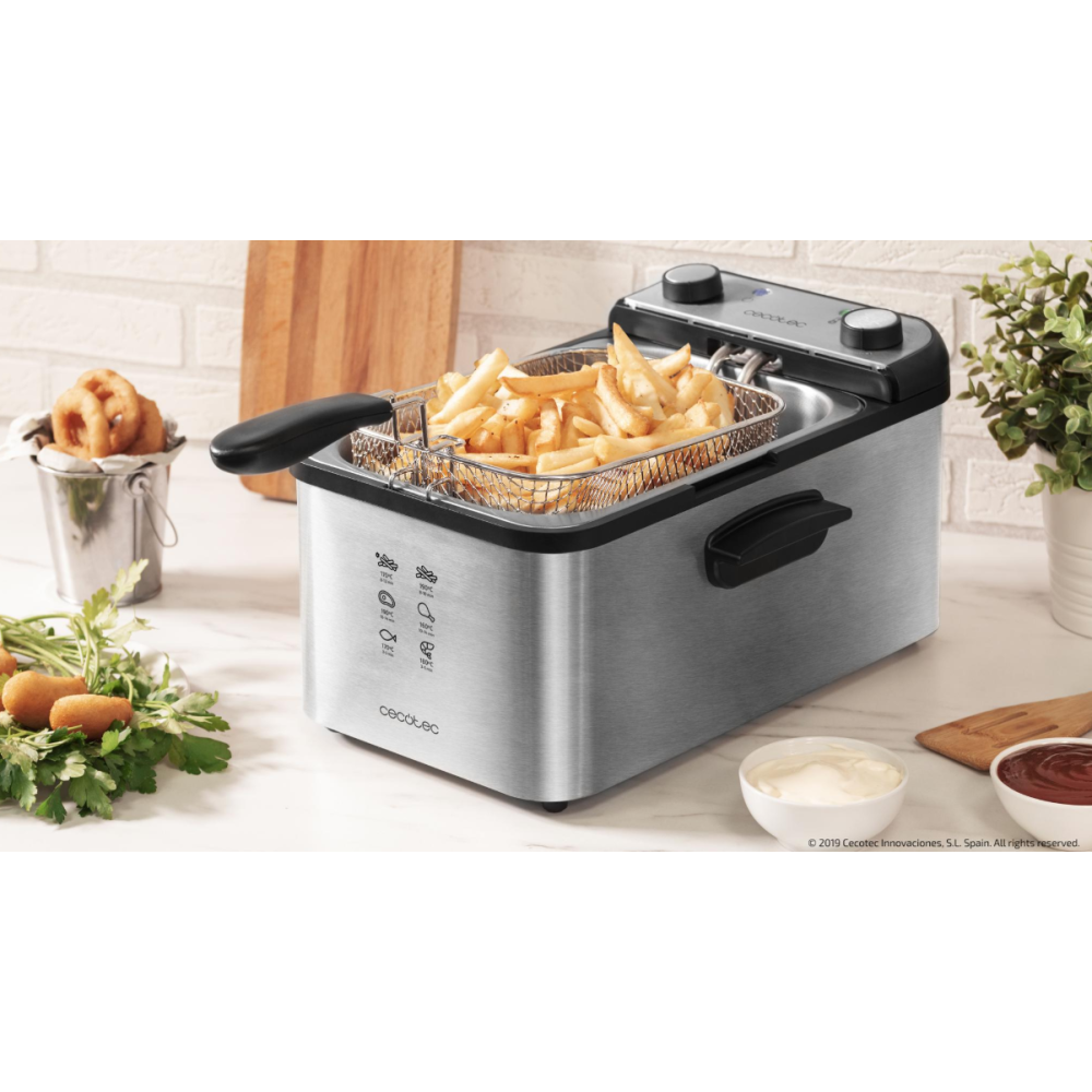 Friteuse sans huile CecoFry Cecotec dotée d'un thermostat pour régler la température entre 80 et 200°C - Conçue dans un design élégant incluant des finitions en acier inoxydable - Permet de cuisiner avec 1 seule cuillère d’huile - Dispose d'un récipient d'une contenance de 5.5 litres pour cuisiner - Équipée d'un moteur d'une puissance de 1700 Watts - Intègre un minuteur allant jusqu'à 60 minutes - Dimensions : 26 cm x 31,6 cm x 30,5 cm – Poids de l'article 4 kg.
