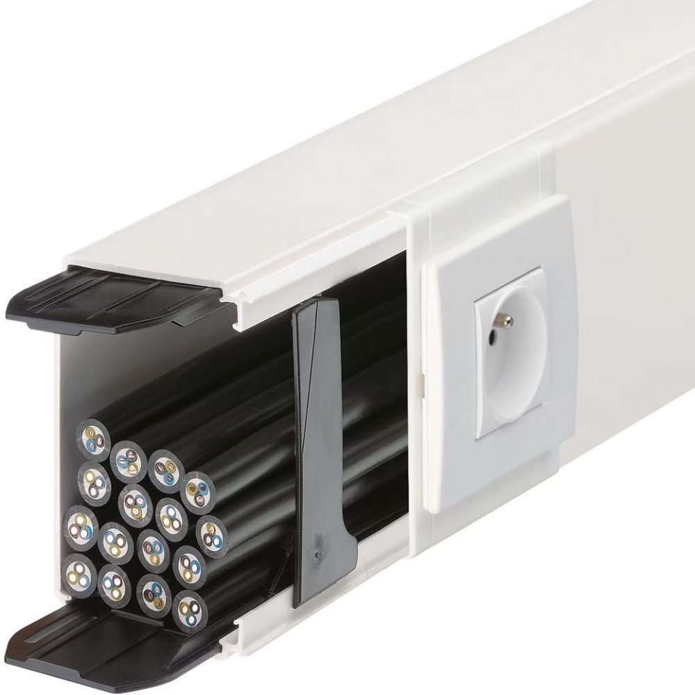 Goulotte Hager LFF6011009016 Lifea PVC + 2 éclisses + 4 agrafes M7249 - Hauteur : 60 mm - Largeur : 110 mm - Longueur : 2000 mm - Section transversale utile : 5460 mm² - Matériau : Plastique - Conditionnement : 2 unités.