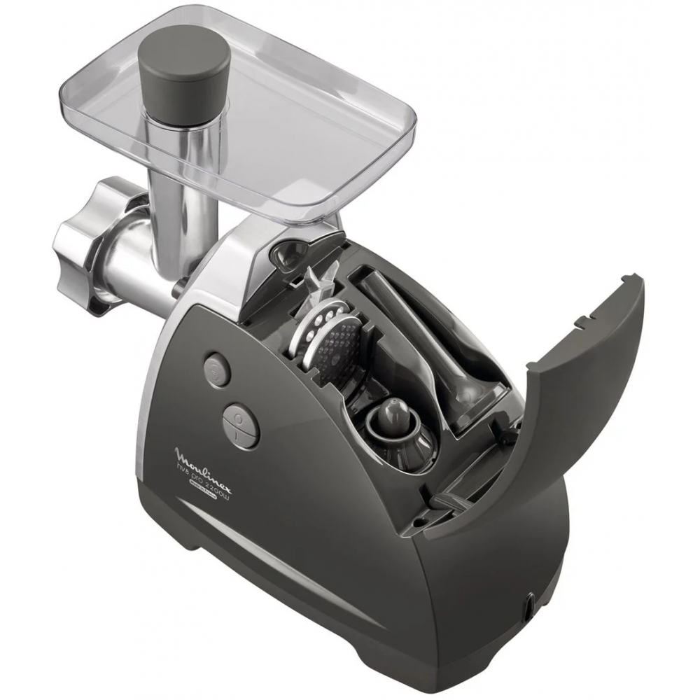 Hâchoir à viande Moulinex ME686832 - Fonctions appareil de cuisine : Hacher - Mode d'alimentation : Secteur - Connecté : Non - Puissance : 2200 W - Sécurité : Oui - Vitesse de rotation : 4 tr/min - Accessoires fournis : 2 grilles pour hacher fin et gros (4,7 mm et 8 mm). Accessoires pour kebbés et un tube à saucisses inclus - Caractéristiques complémentaires : Livre de recettes - Couteaux : Lame auto-affûtable - Le plus du produit : Fonction "reverse" sécurisée : ne peut pas être activée accidentellement et protège le moteur de la panne - Origine de fabrication : France - Disponibilité des pièces détachées : 15 ans.